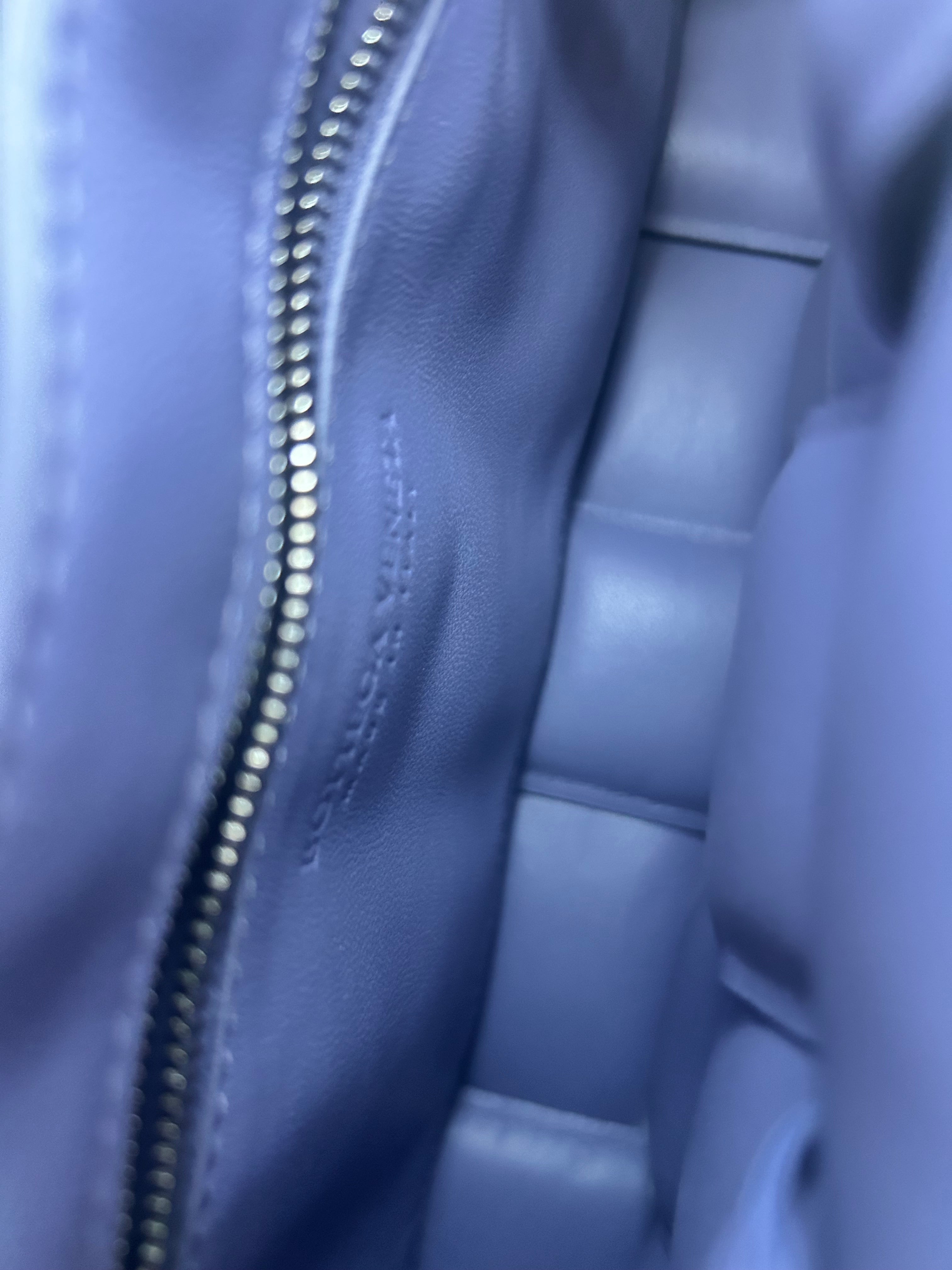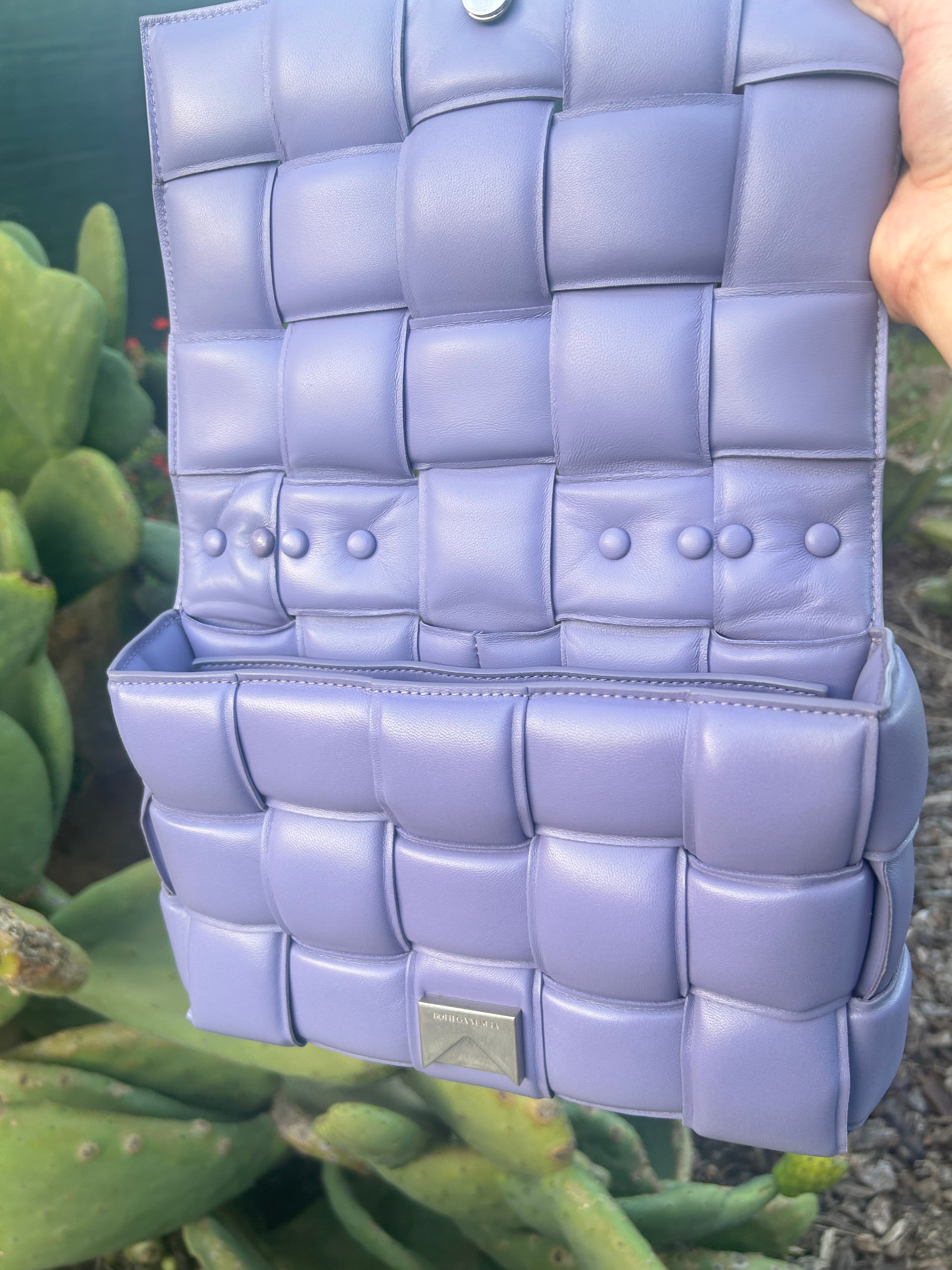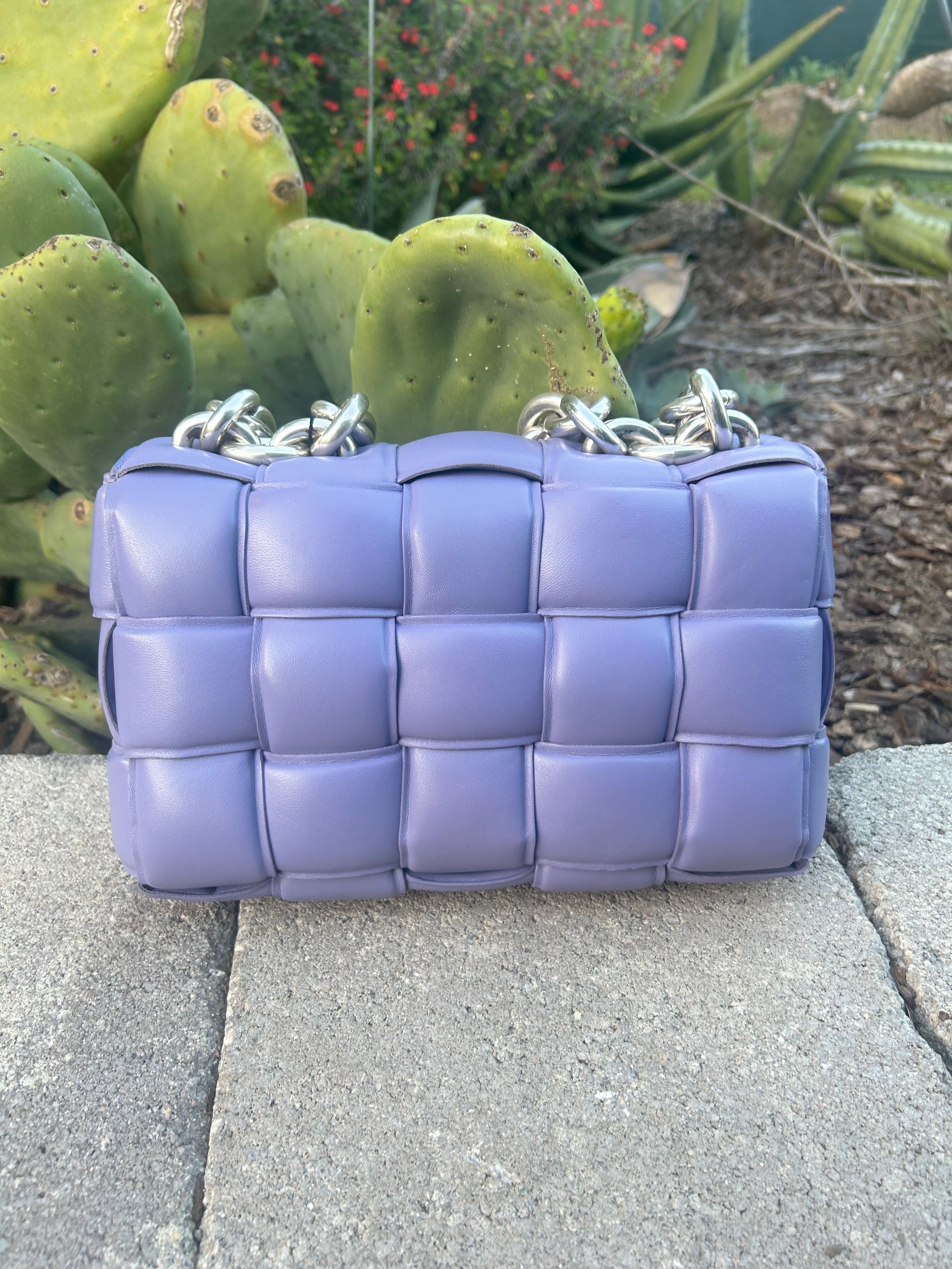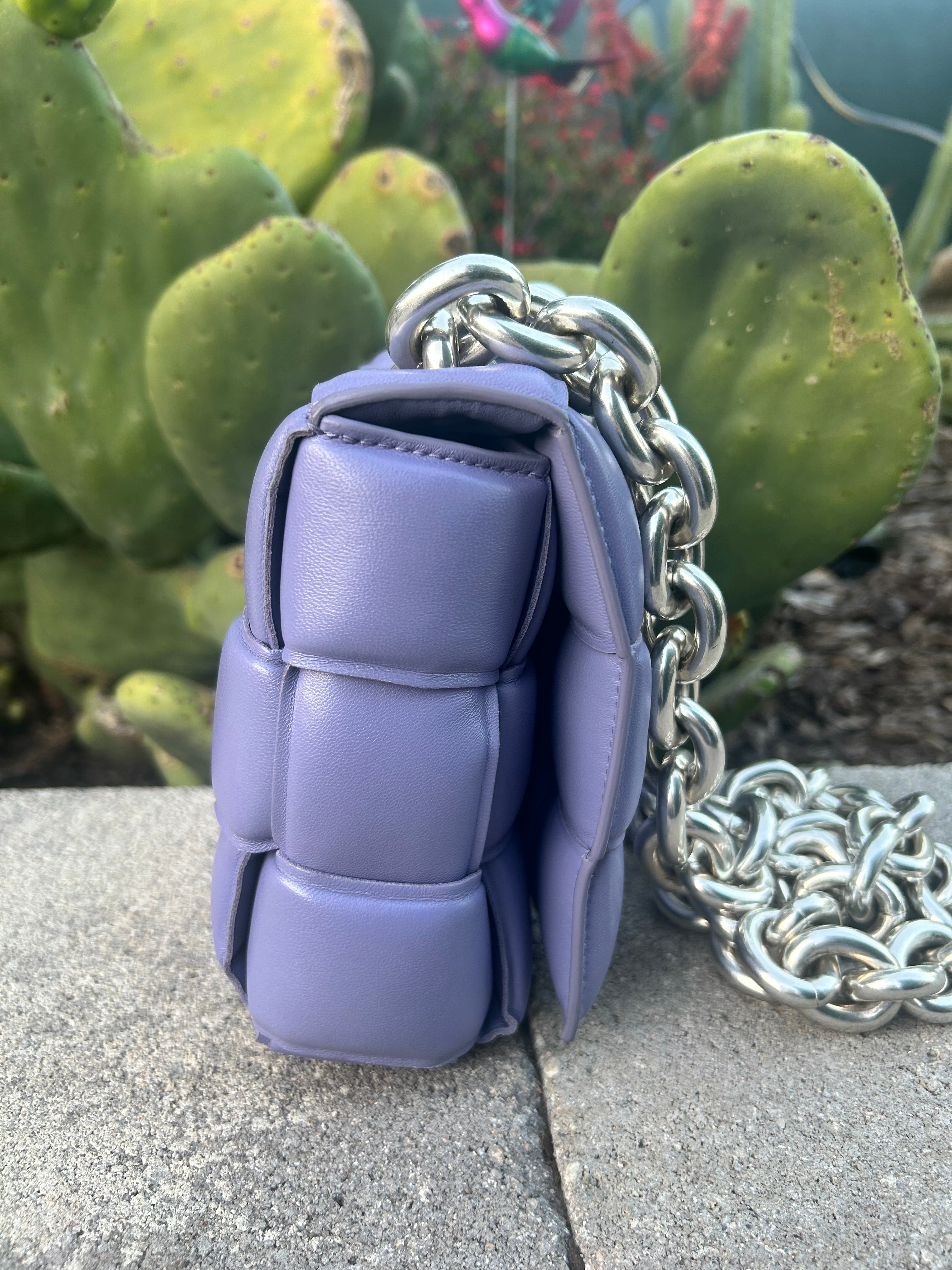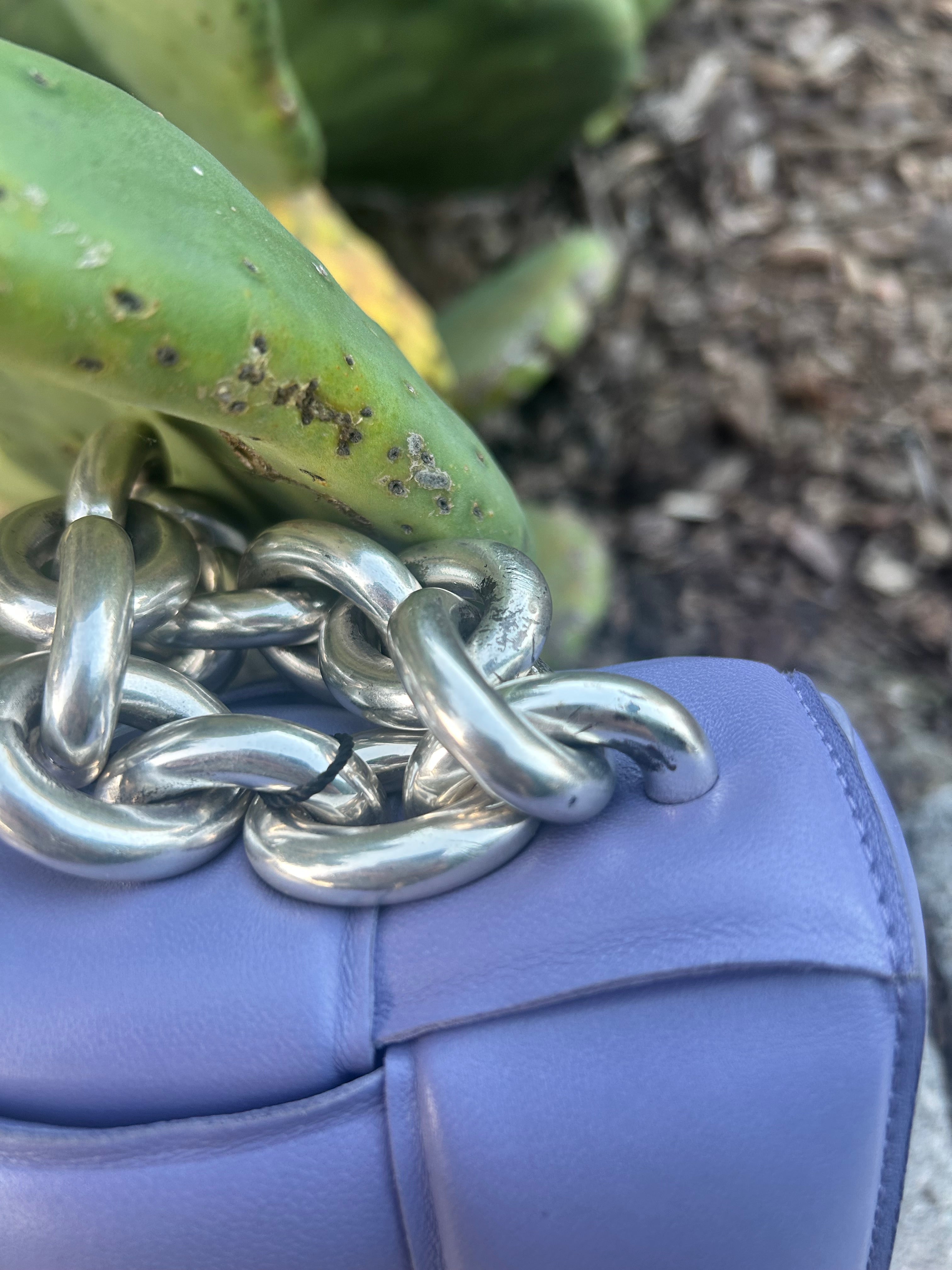 Great condition. Lavender/Purple leather with silver chunky top handle and shoulder strap. Minor tarnish to chain (see last picture). Comes with dust bag.