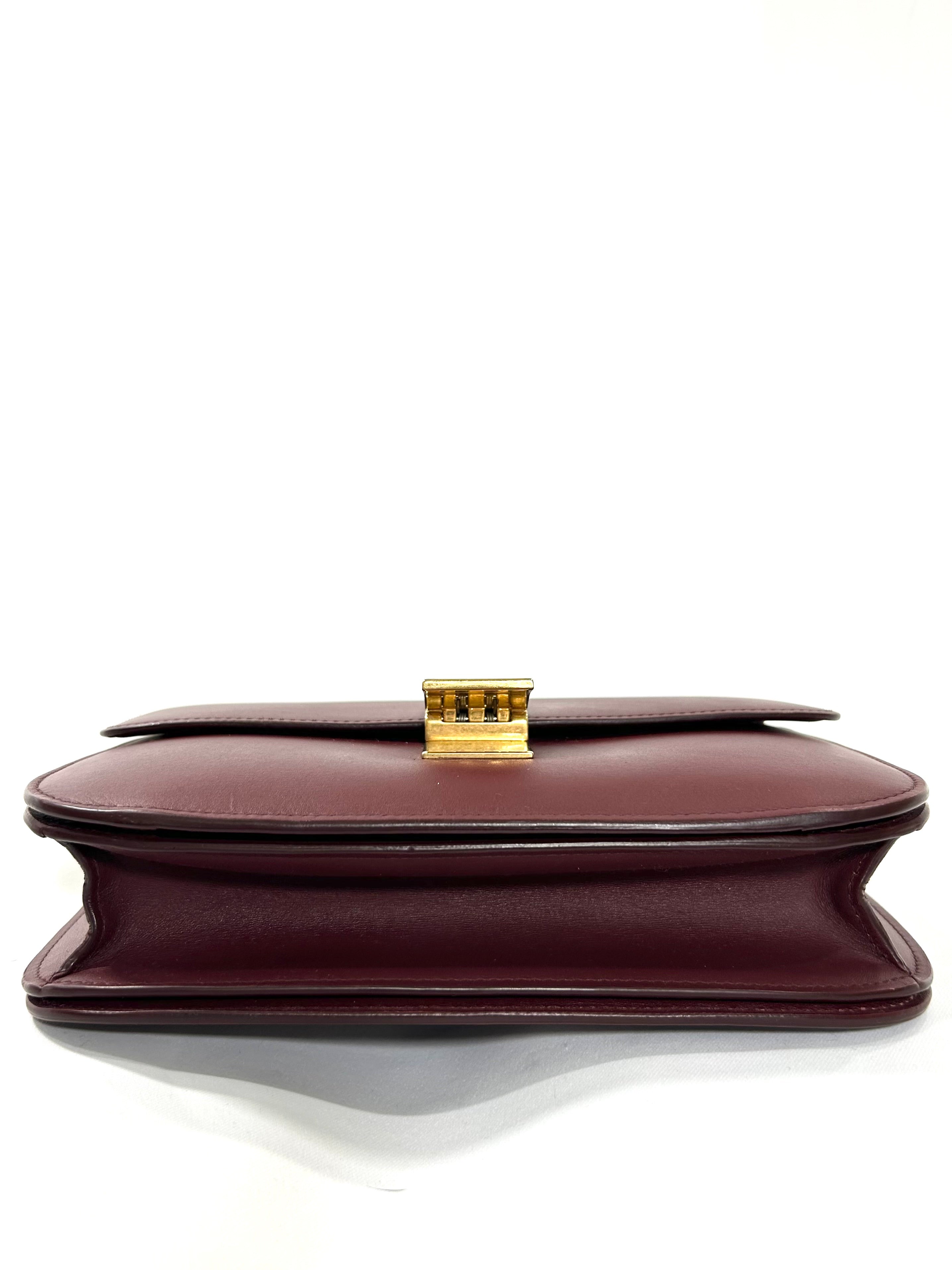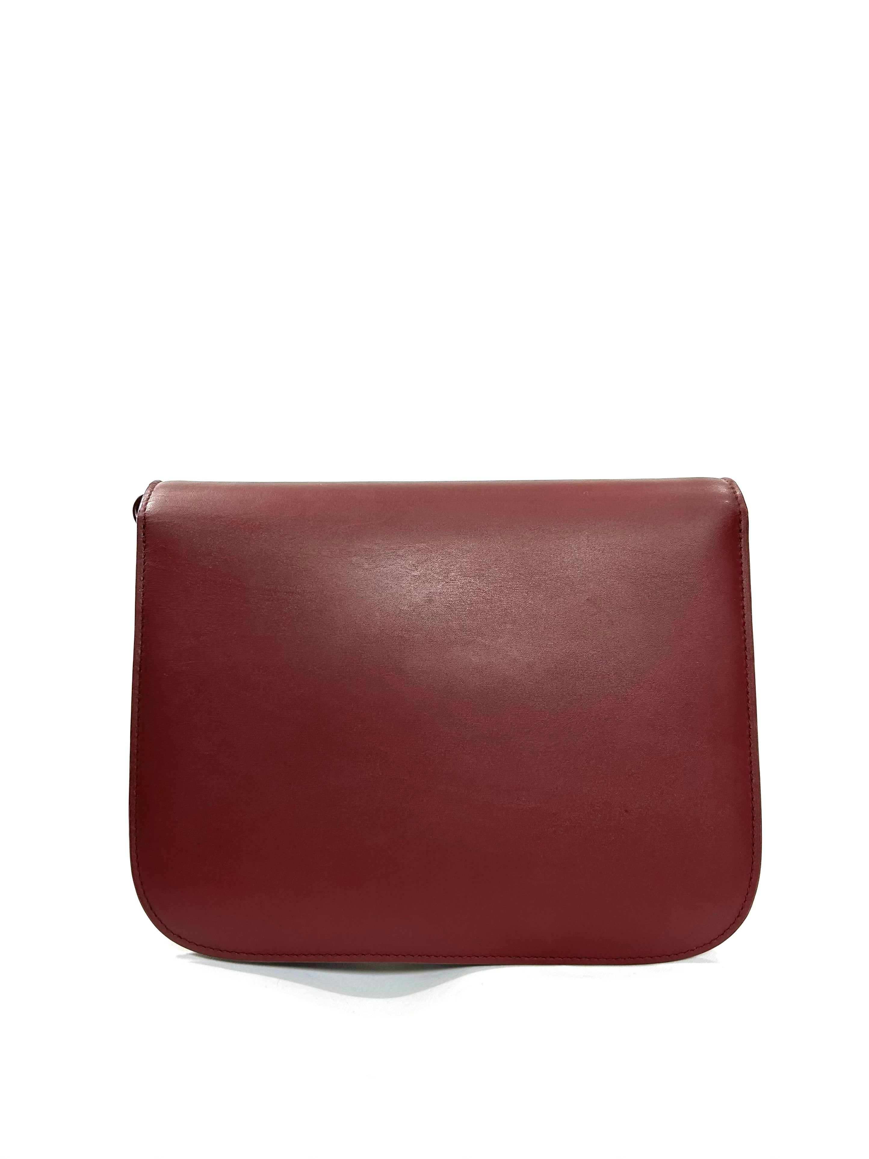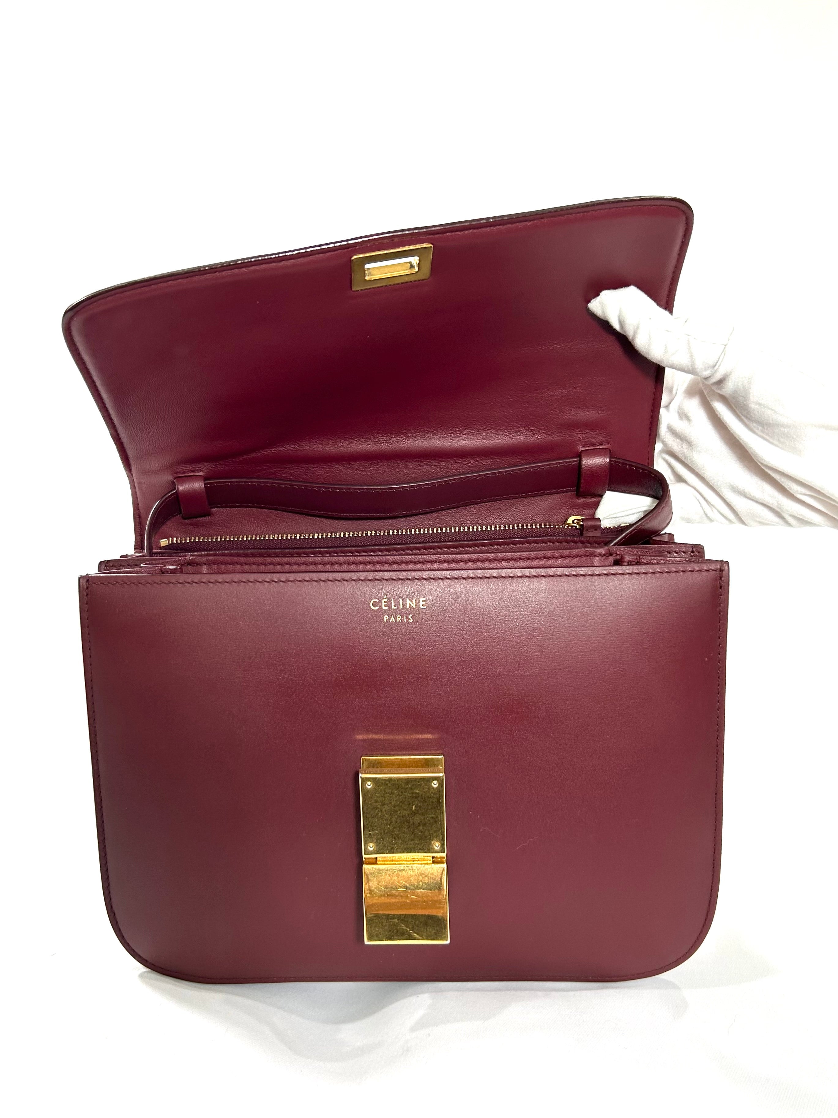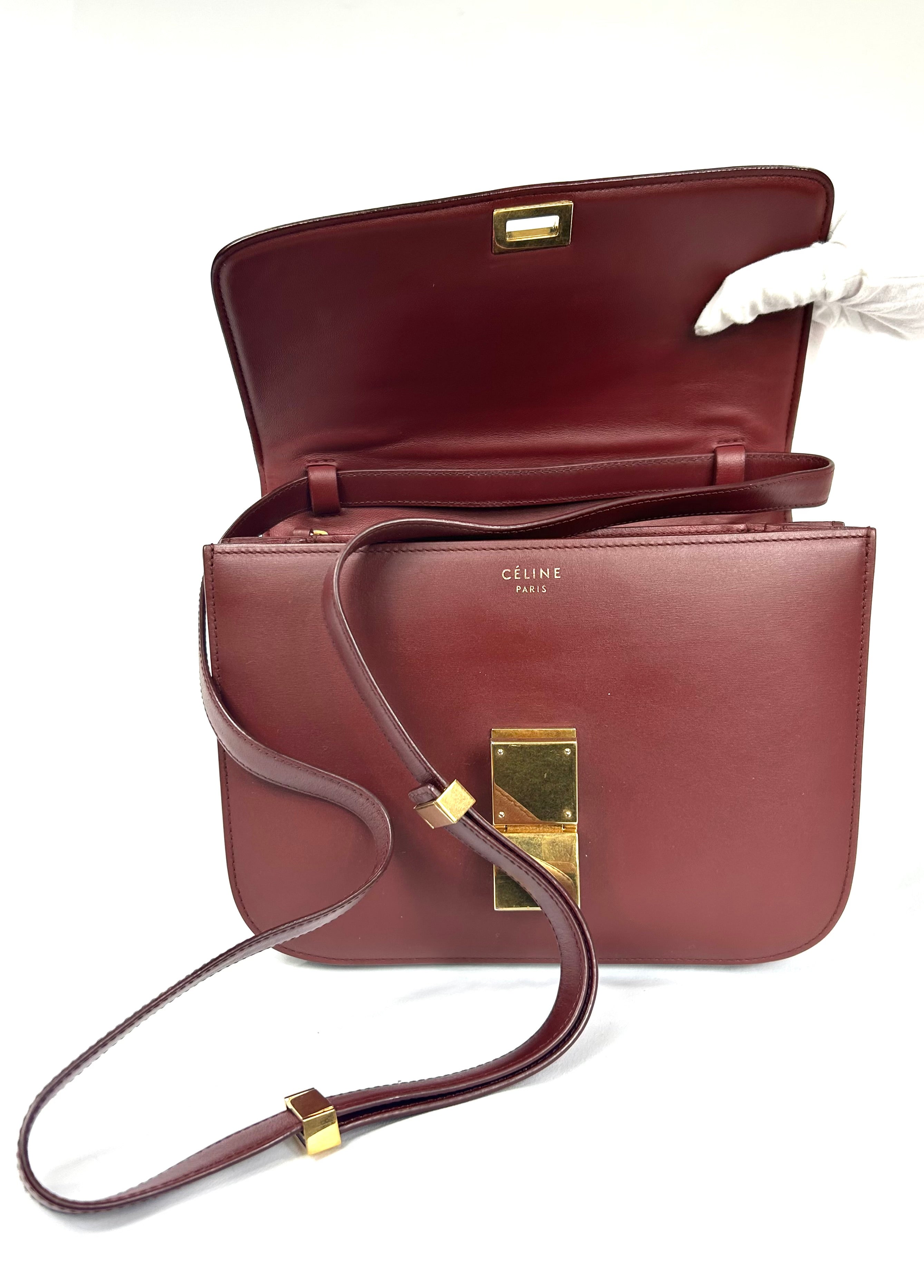 Great condition. Medium size. Burgandy. Gold hardware. Long crossbody strap. Minor scratches to hardware. No stains, odor or wear. Does not come with Celine dust bag. Size: 9Wx7Hx3D
