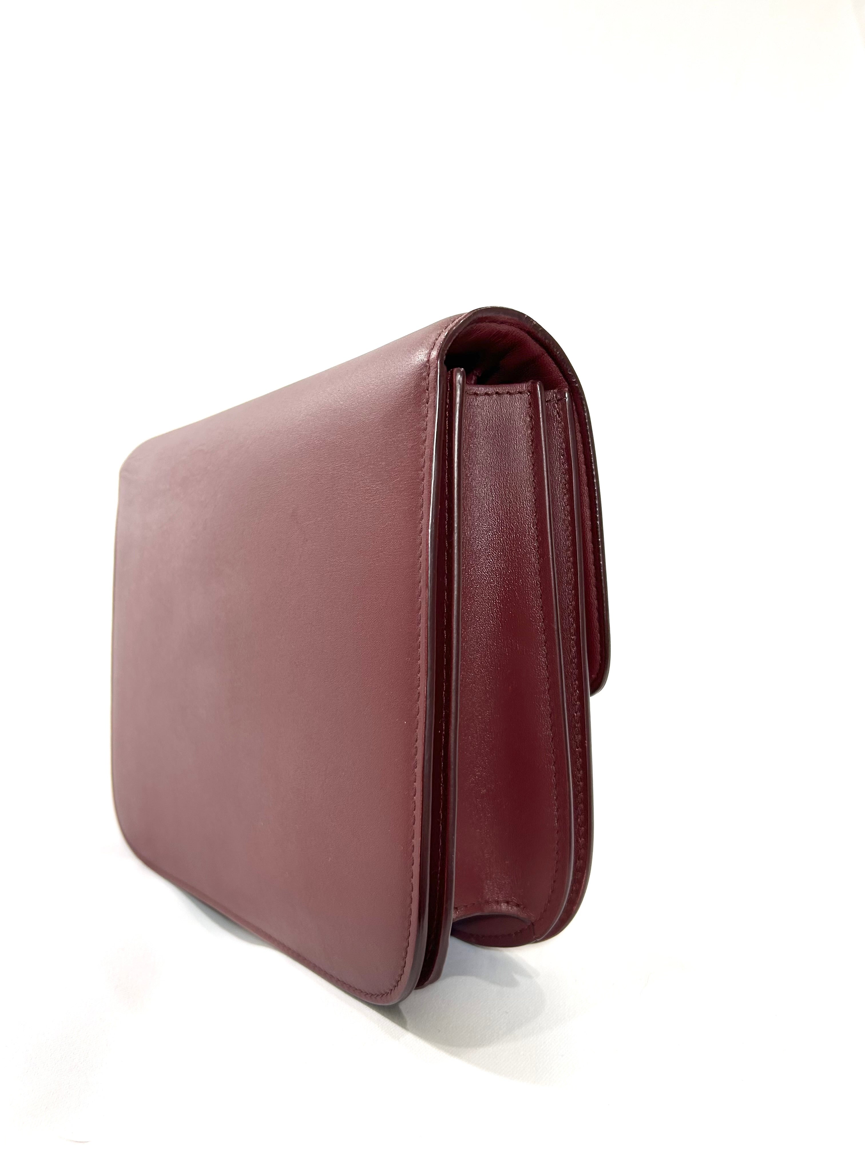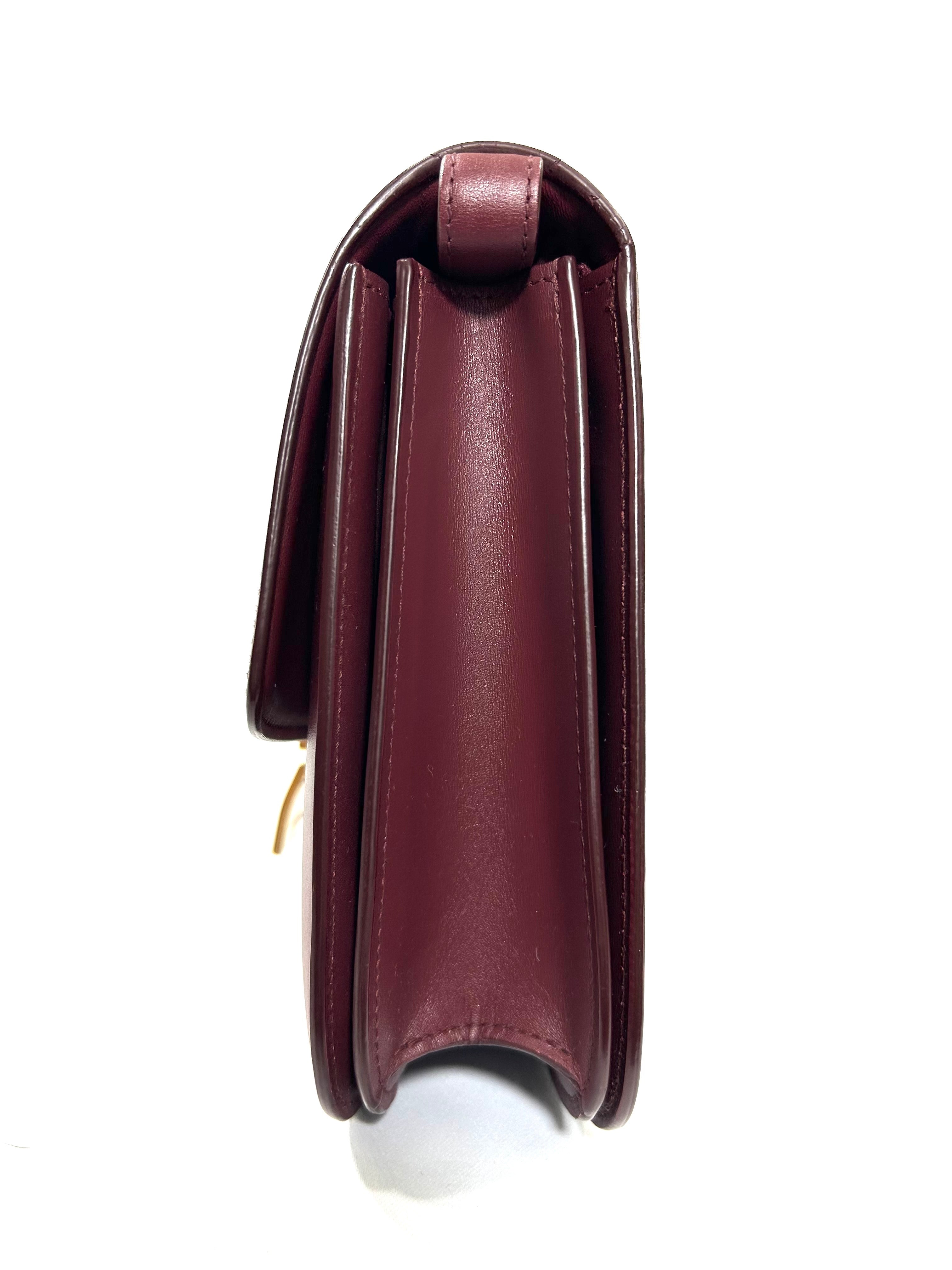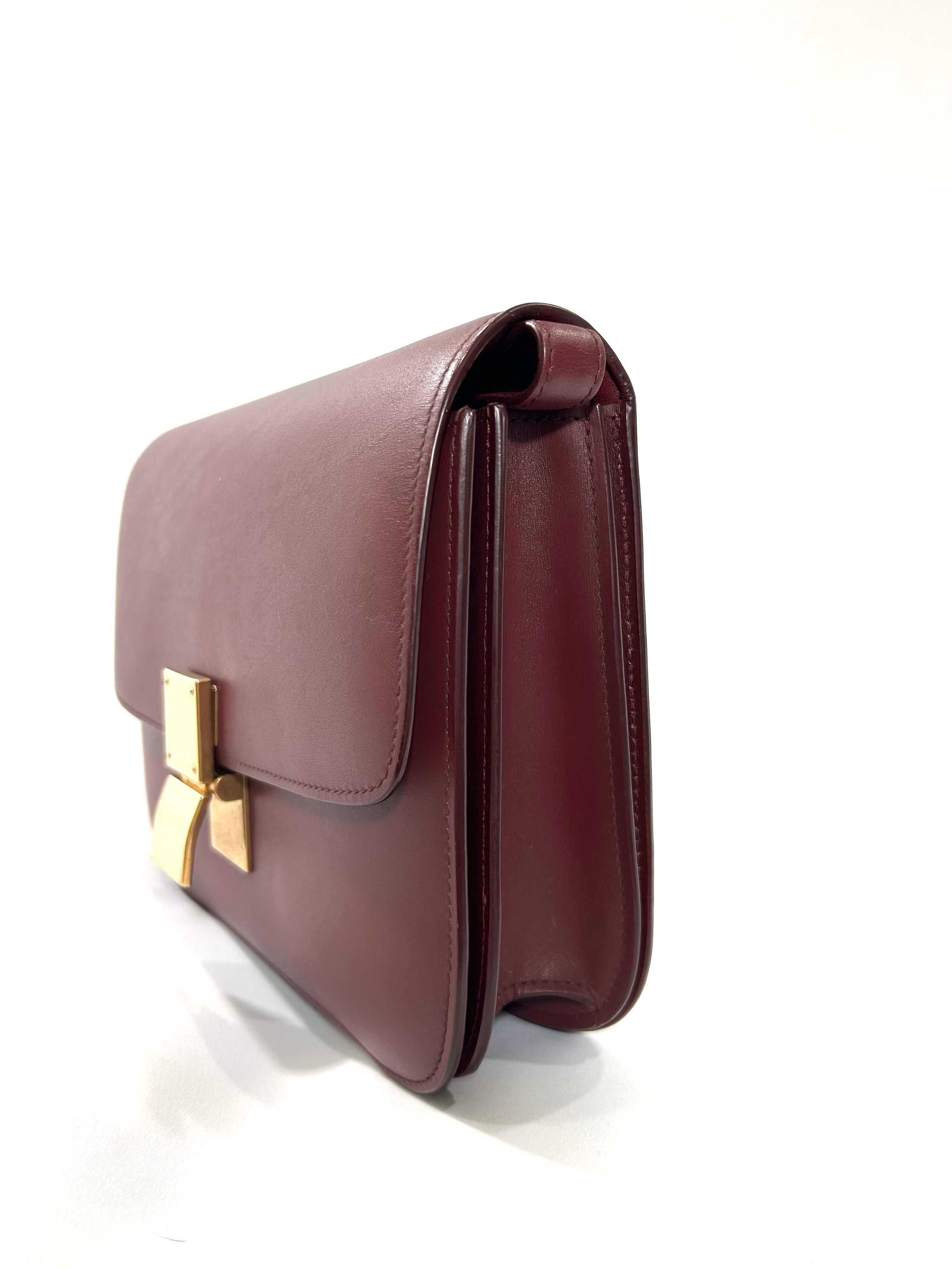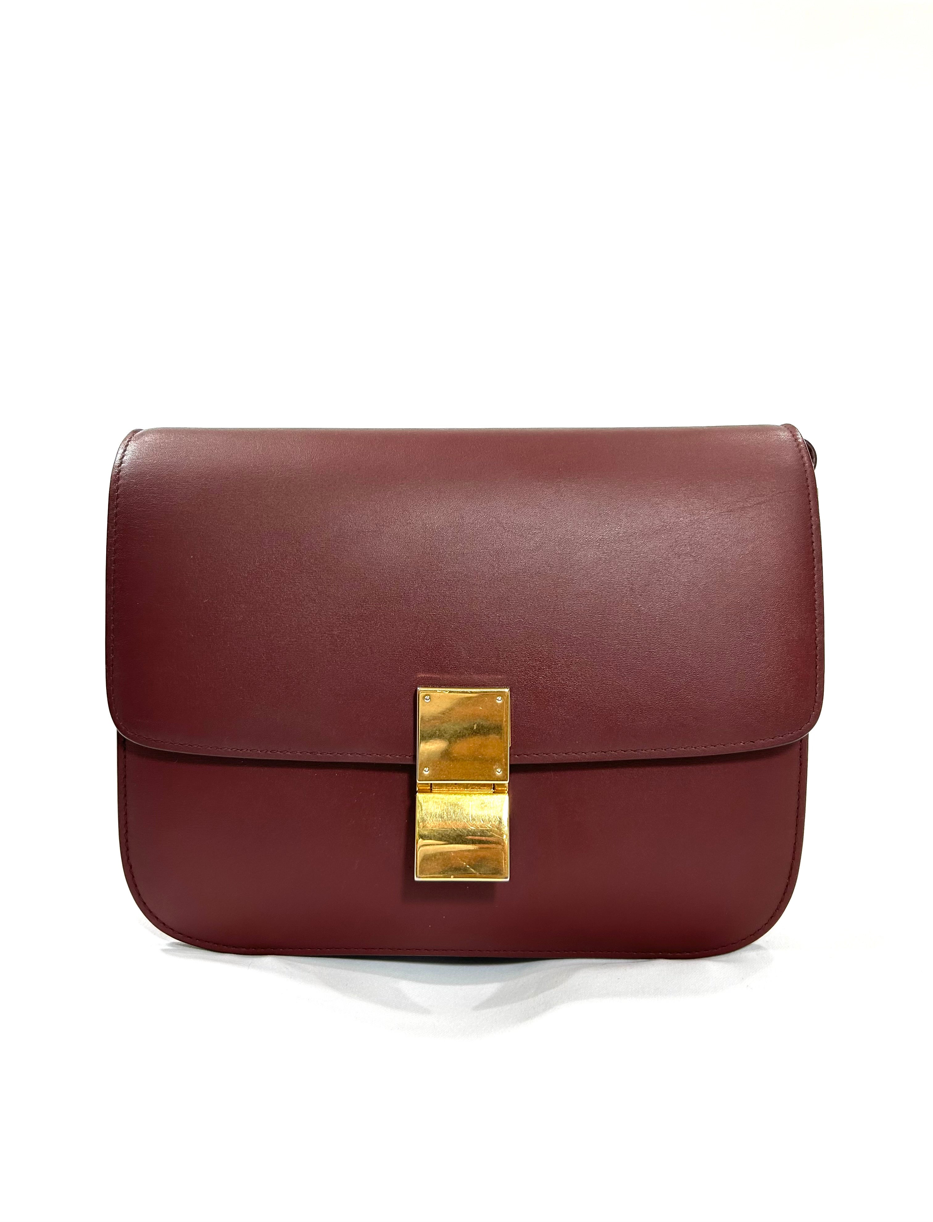 Great condition. Medium size. Burgandy. Gold hardware. Long crossbody strap. Minor scratches to hardware. No stains, odor or wear. Does not come with Celine dust bag. Size: 9Wx7Hx3D