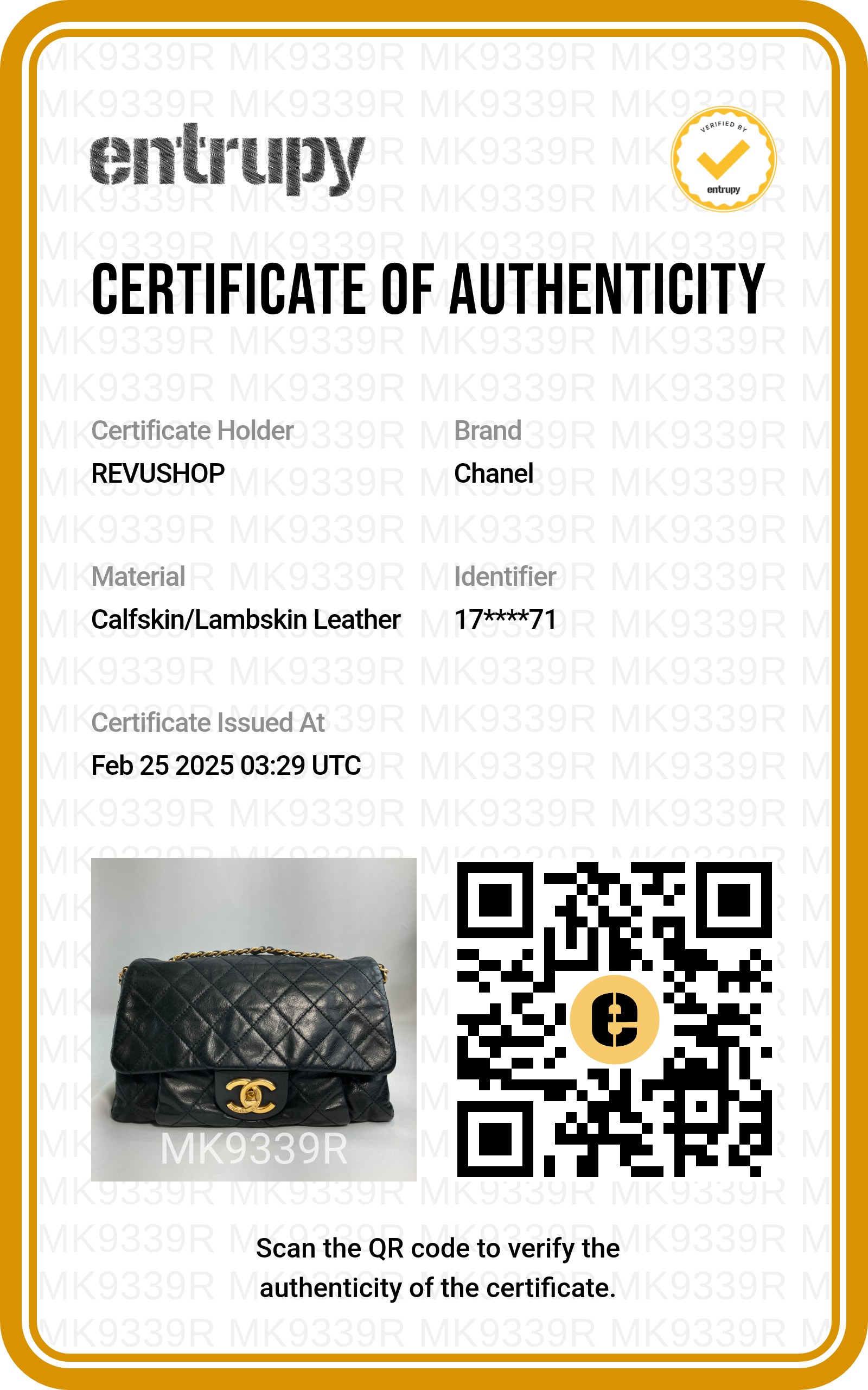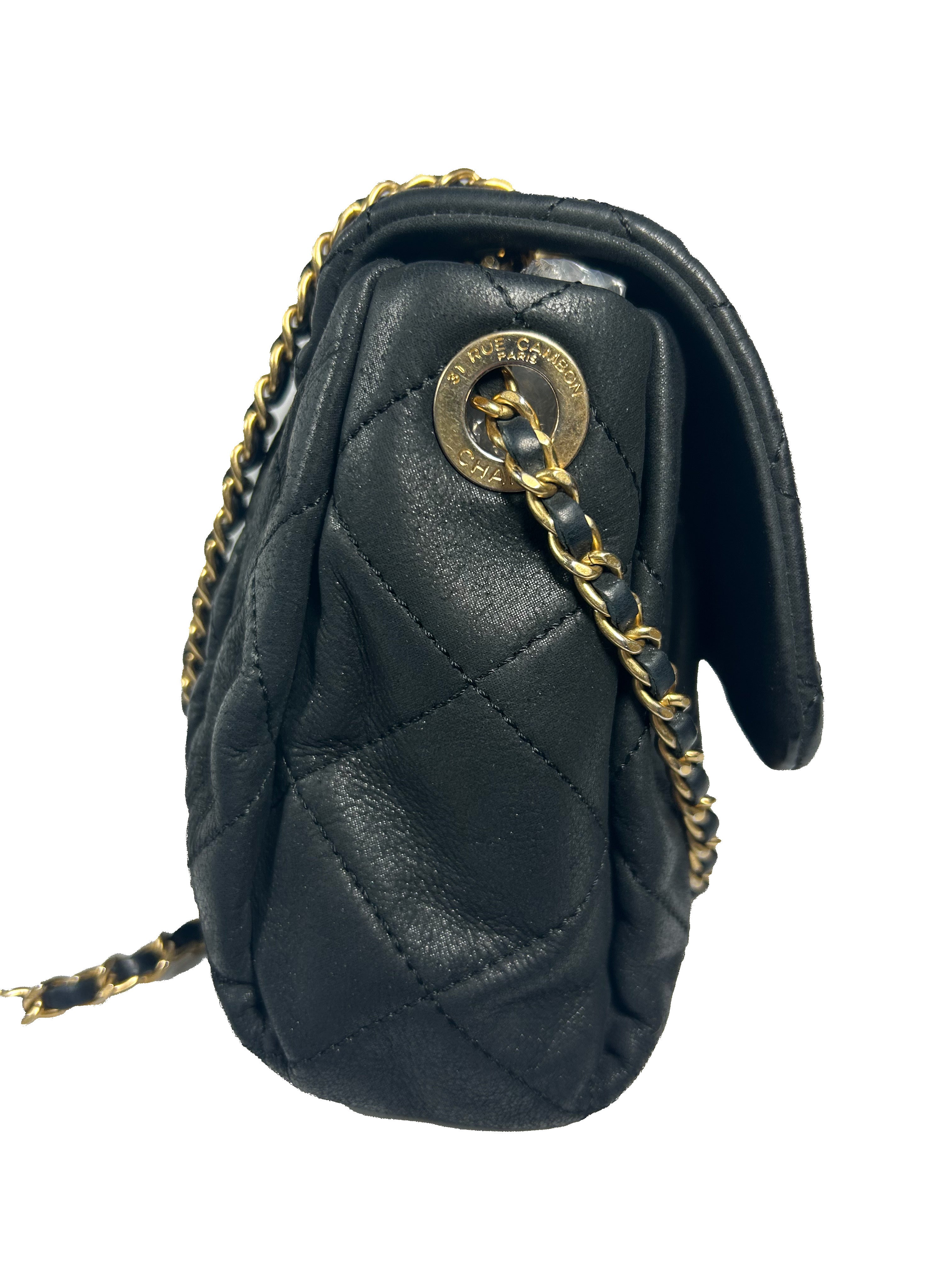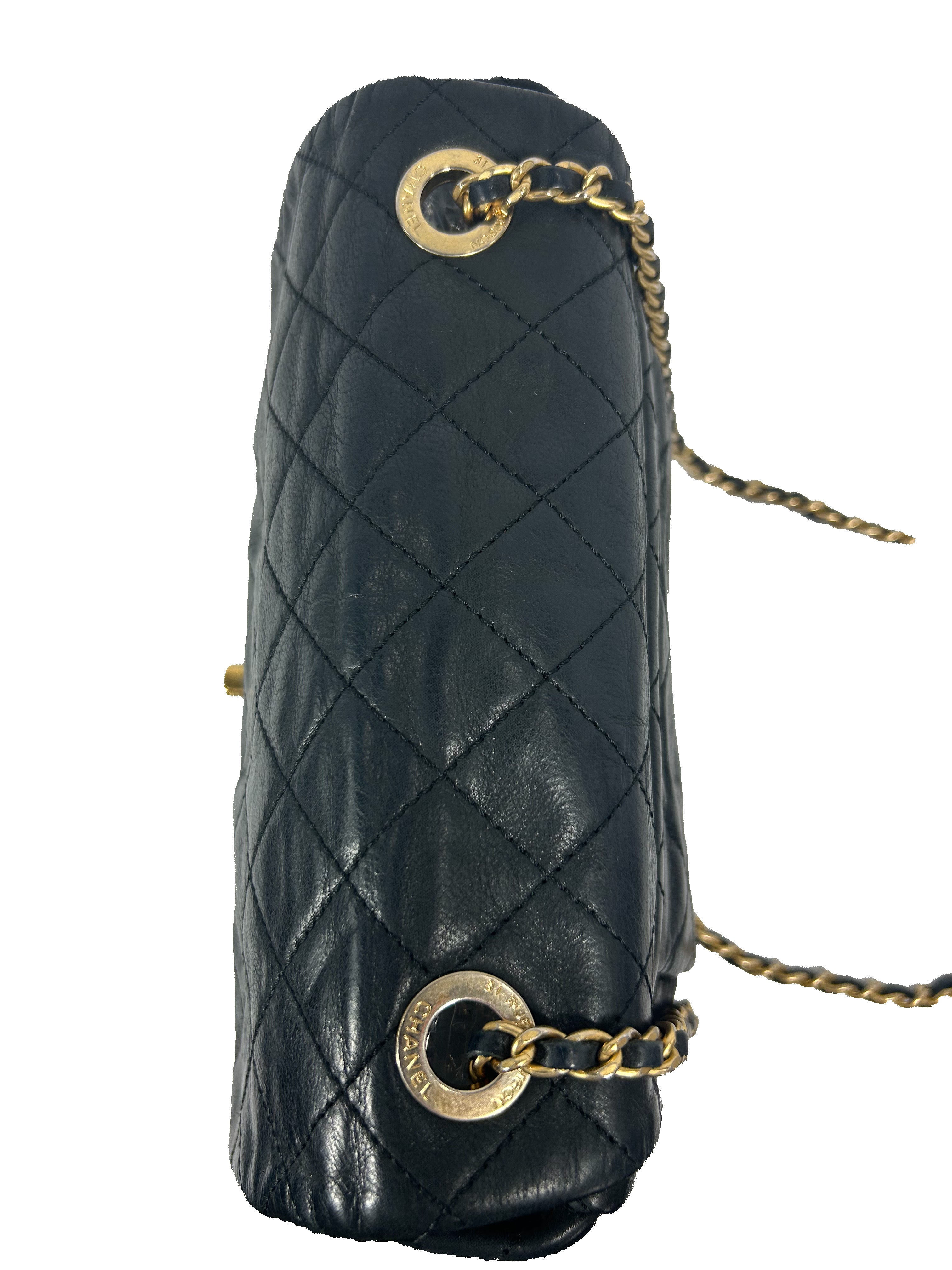 Good condition. Normal patina, wrinkling and softening of the quilted calfskin leather. Some wear and scratches to gold hardware. Dimensions: 6Hx9Wx2D. Long strap. Can wear as a crossbody, shoulder bag or clutch.