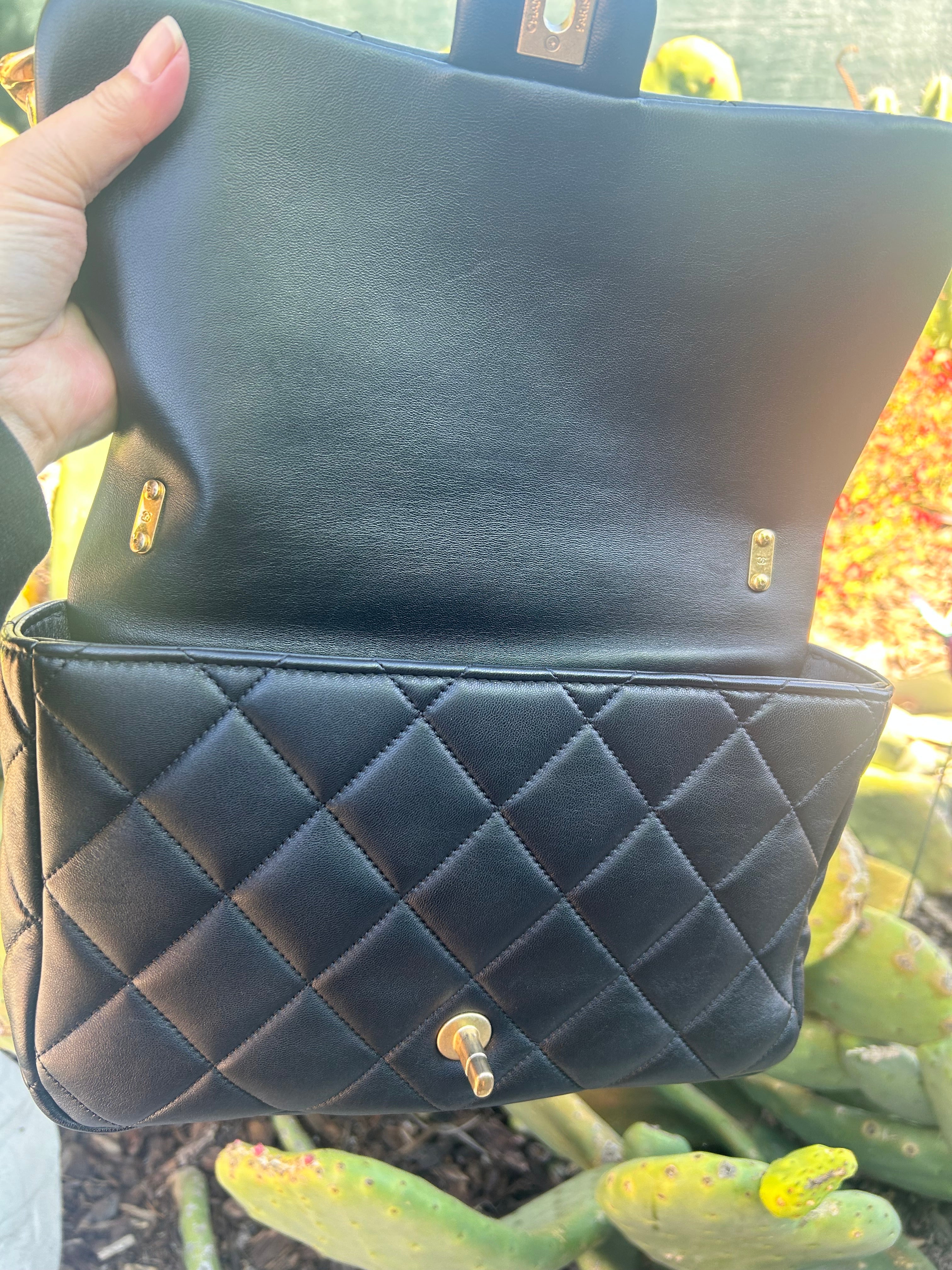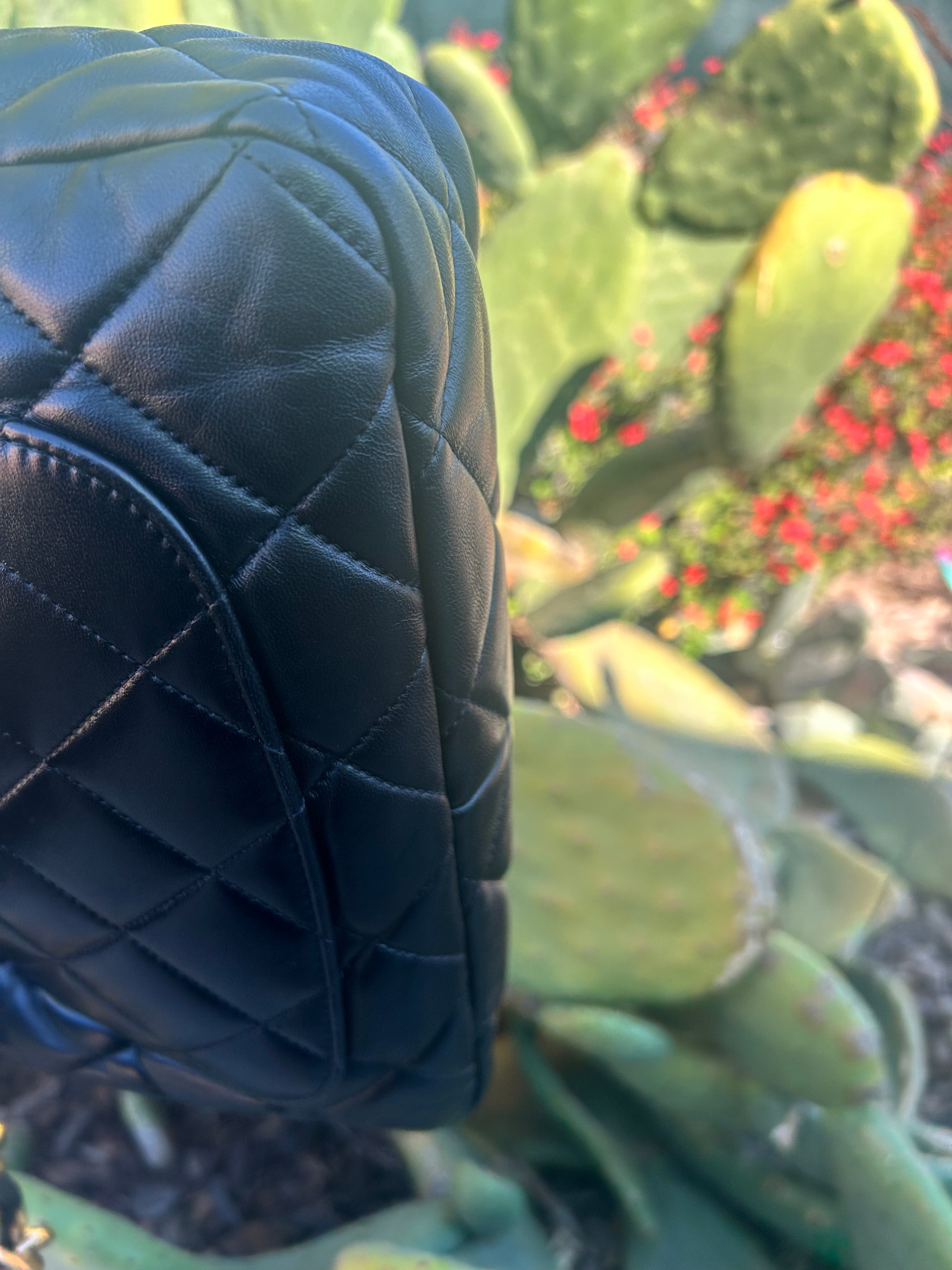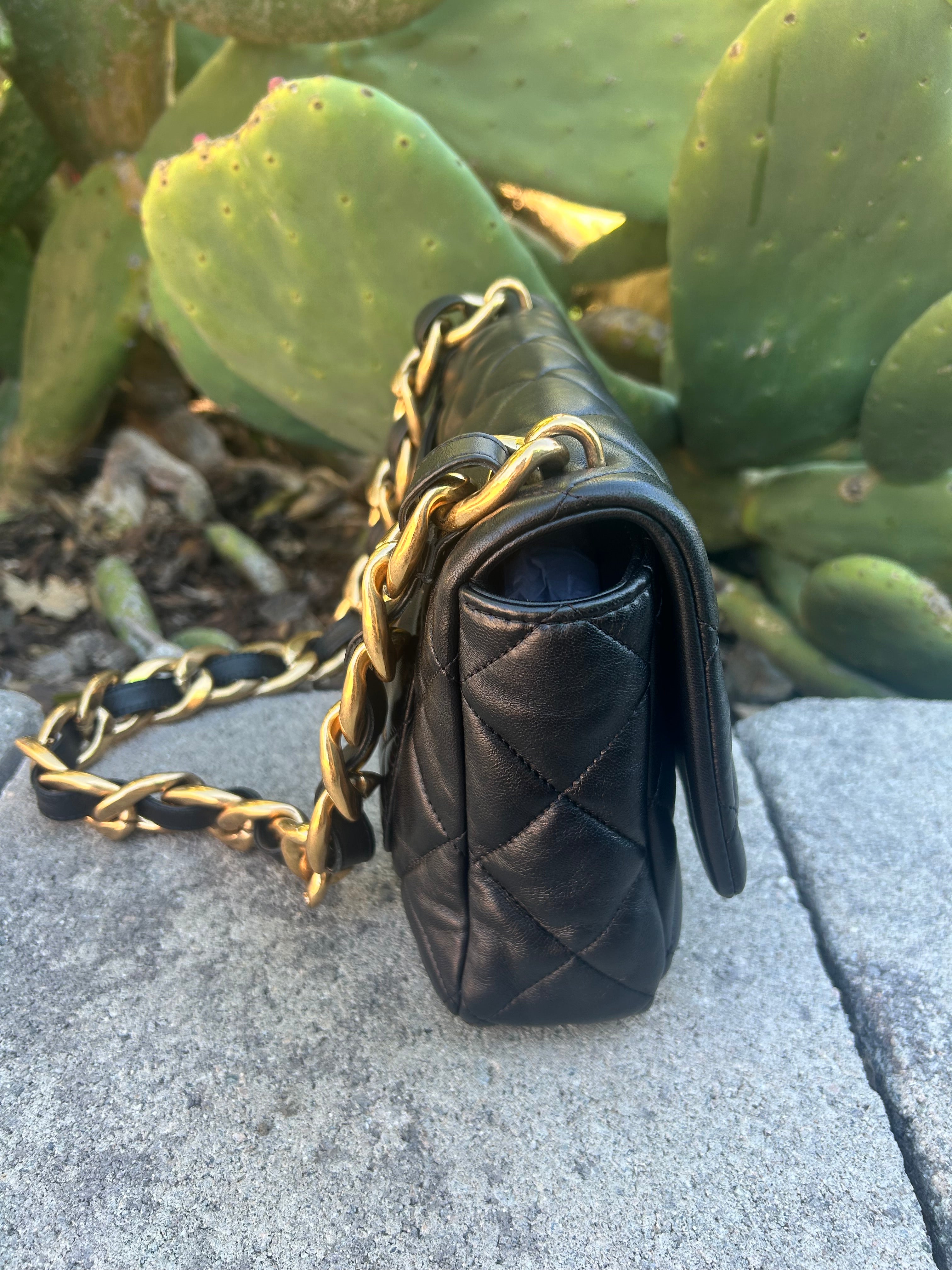 Great condition. Black lambskin with aged gold hardware. Microchipped 2022. Some minor scratches and patina to hardware. Comes with box and dust bag.