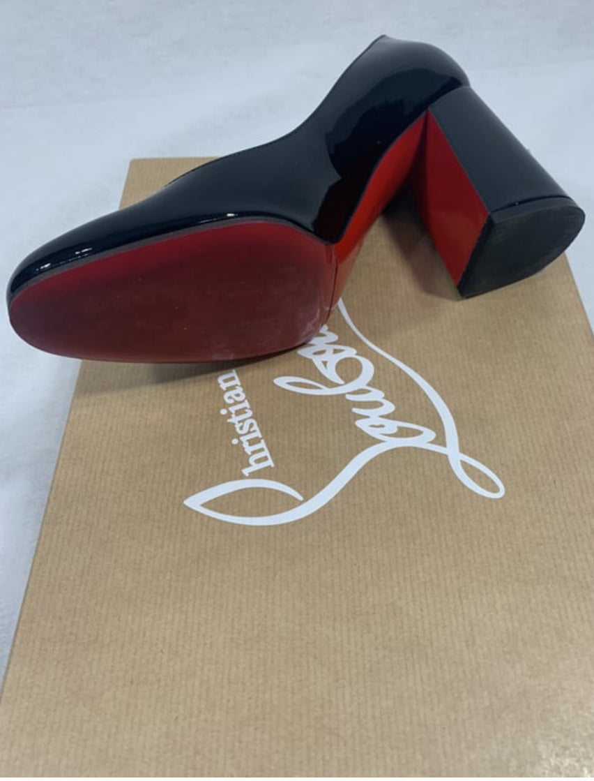 Patent leather. Size 36 EU Red bottom 3 inch pumps. Good condition.