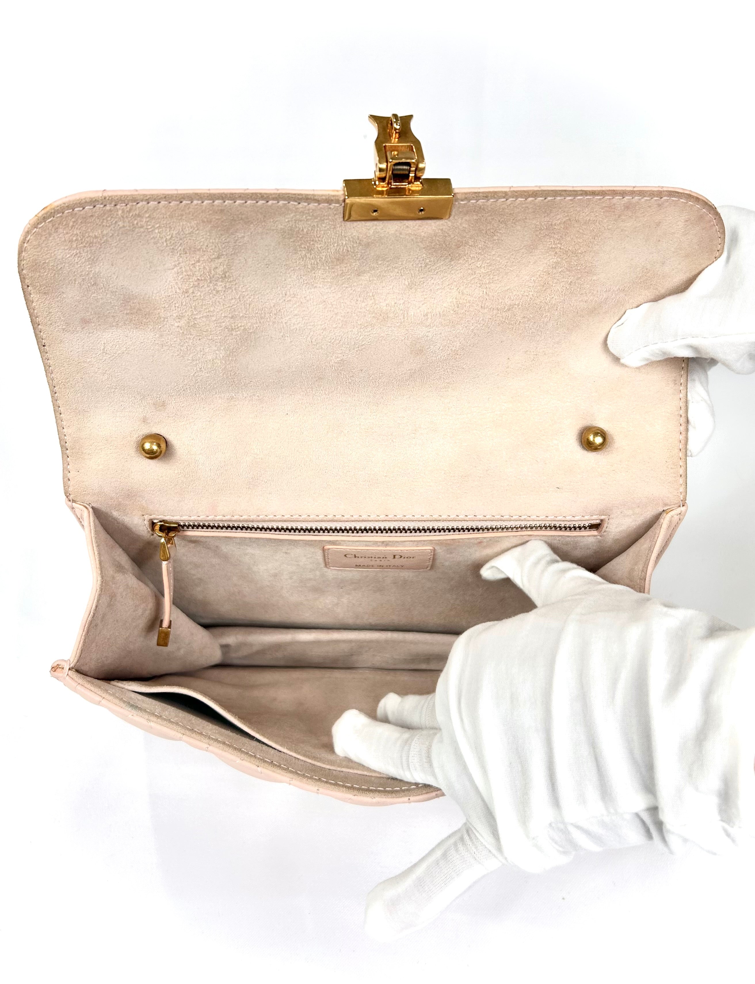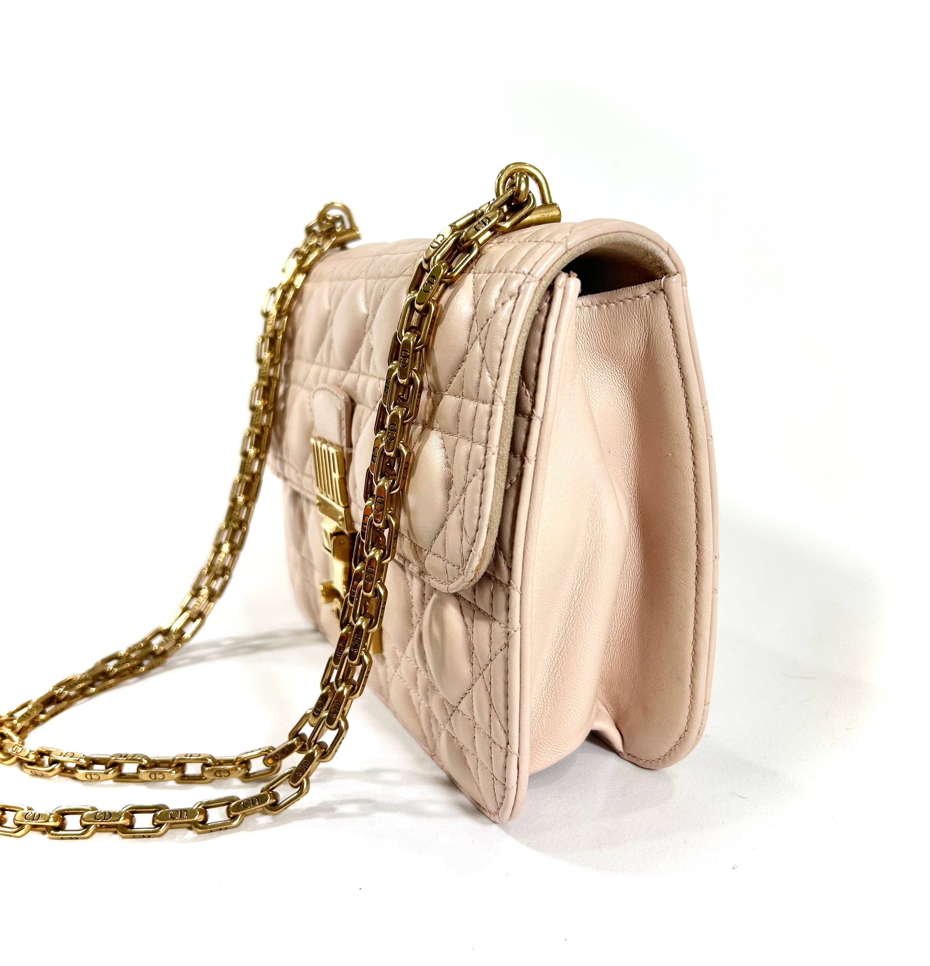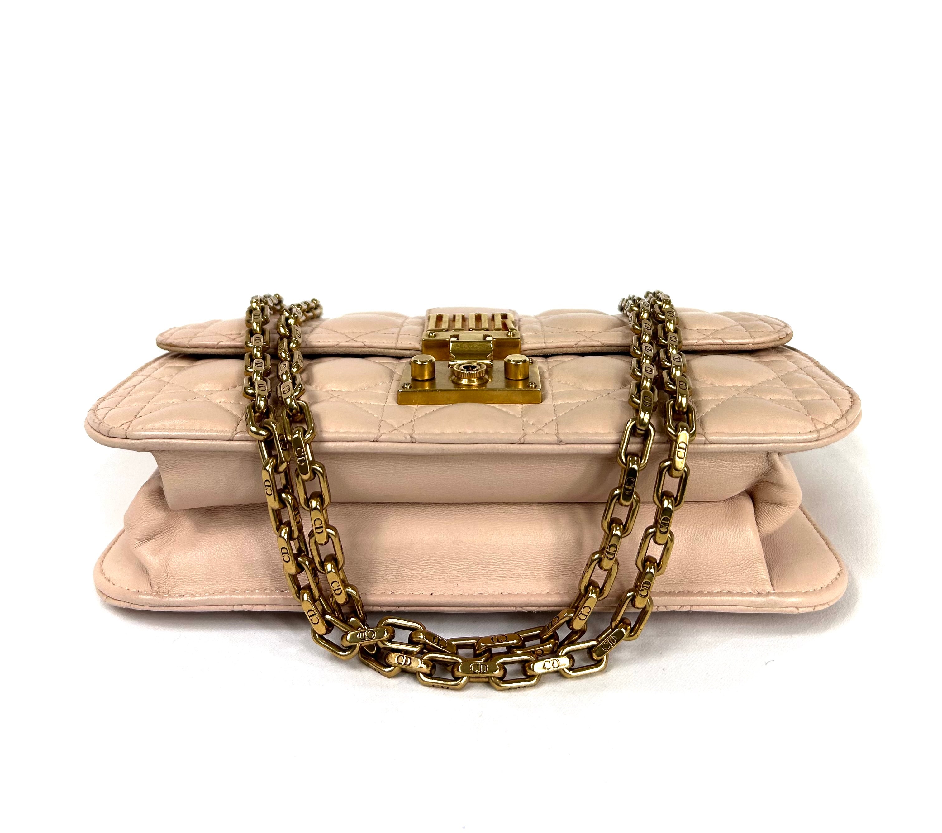 Cannage quilted light pink/beige lamb skin. Great condition. 9Lx6Hx2.5D Brass hardware. Some tarnish to hardware. Chain is removable. Bag can be used as a clutch, shoulder bag or crossbody. No visible scuffs, damage or odor. Clean inside.