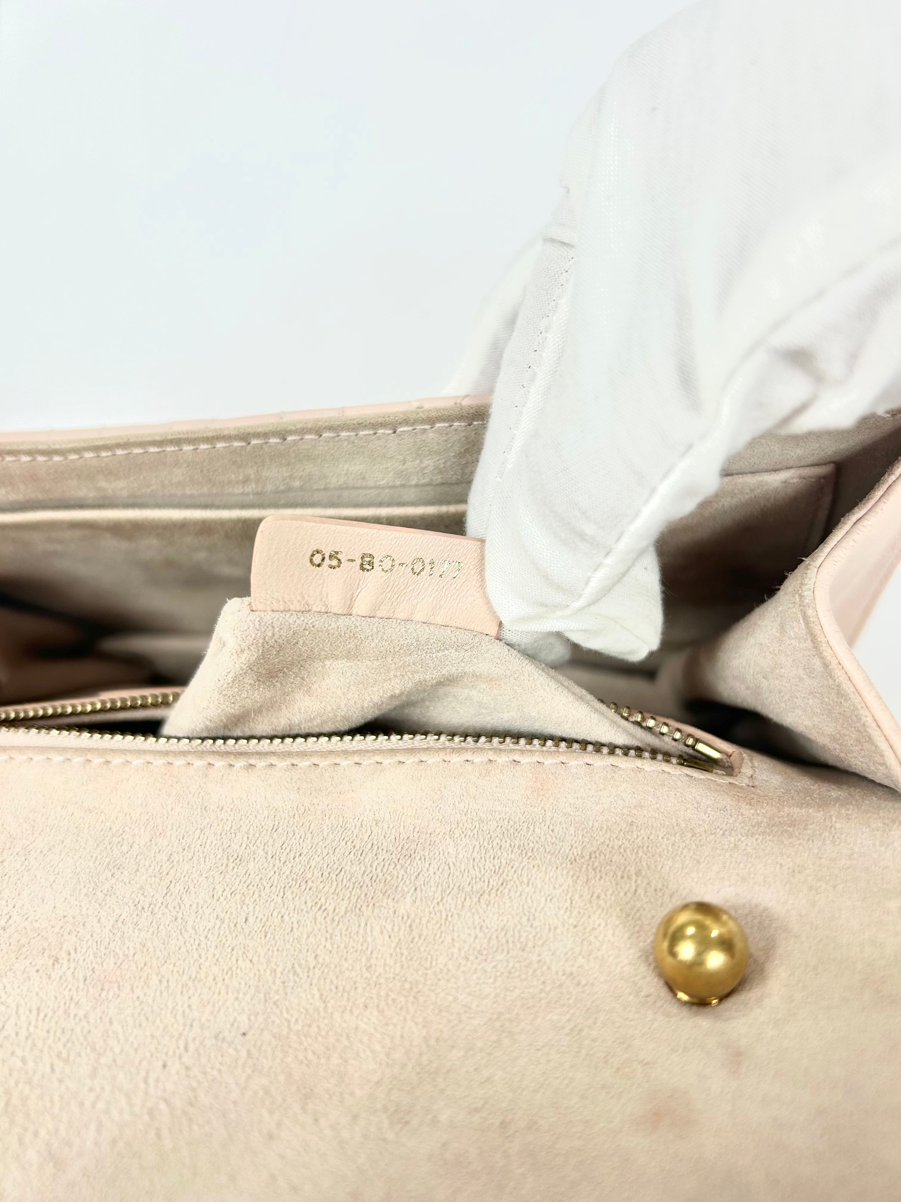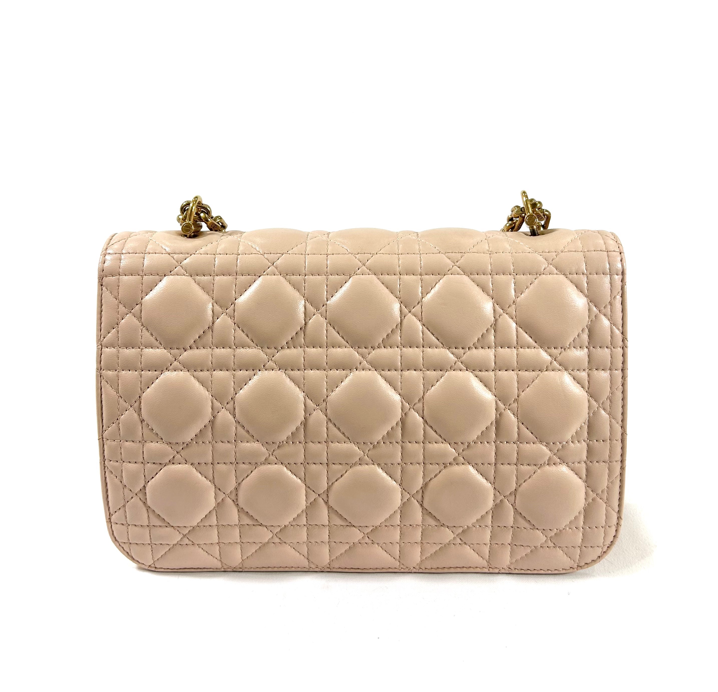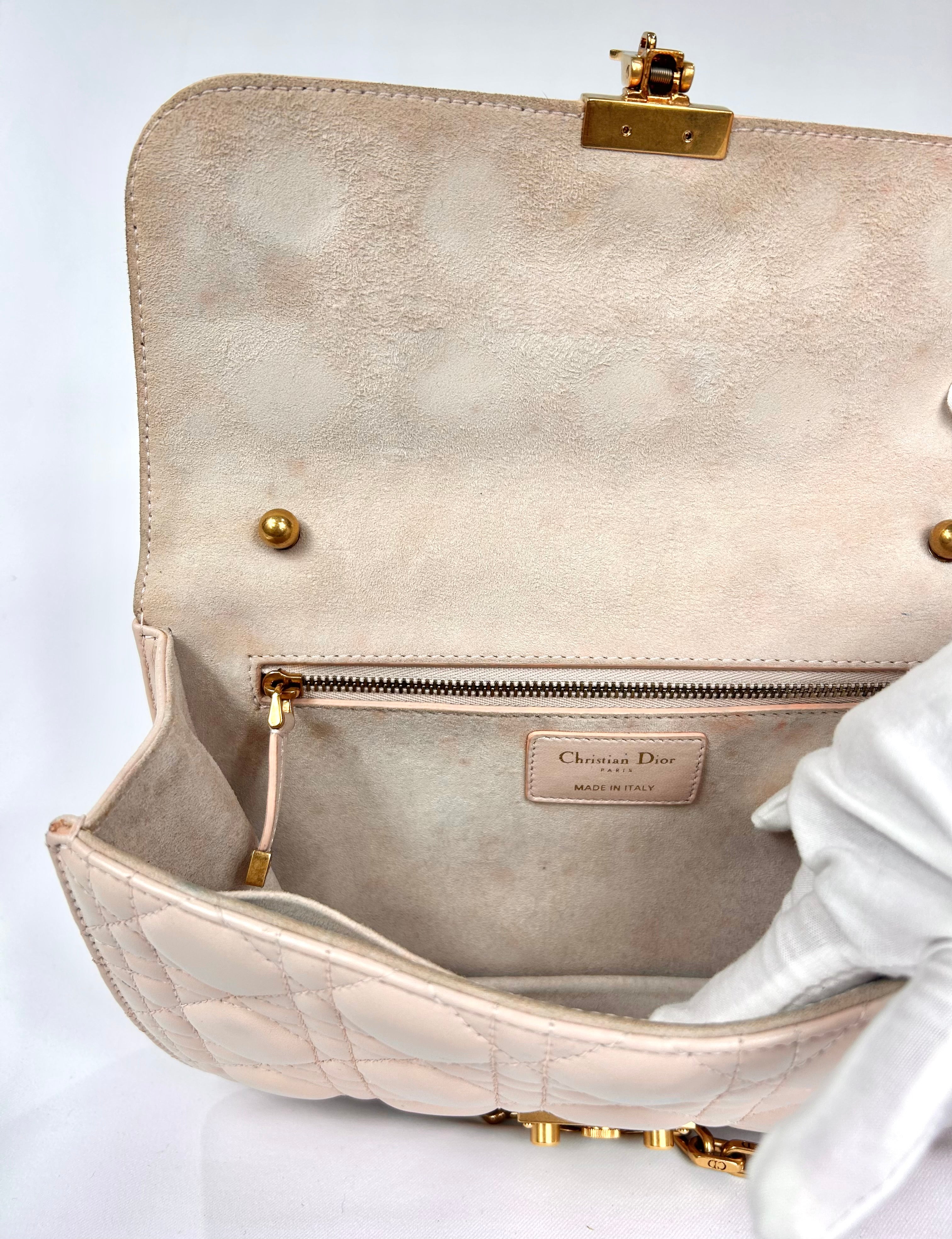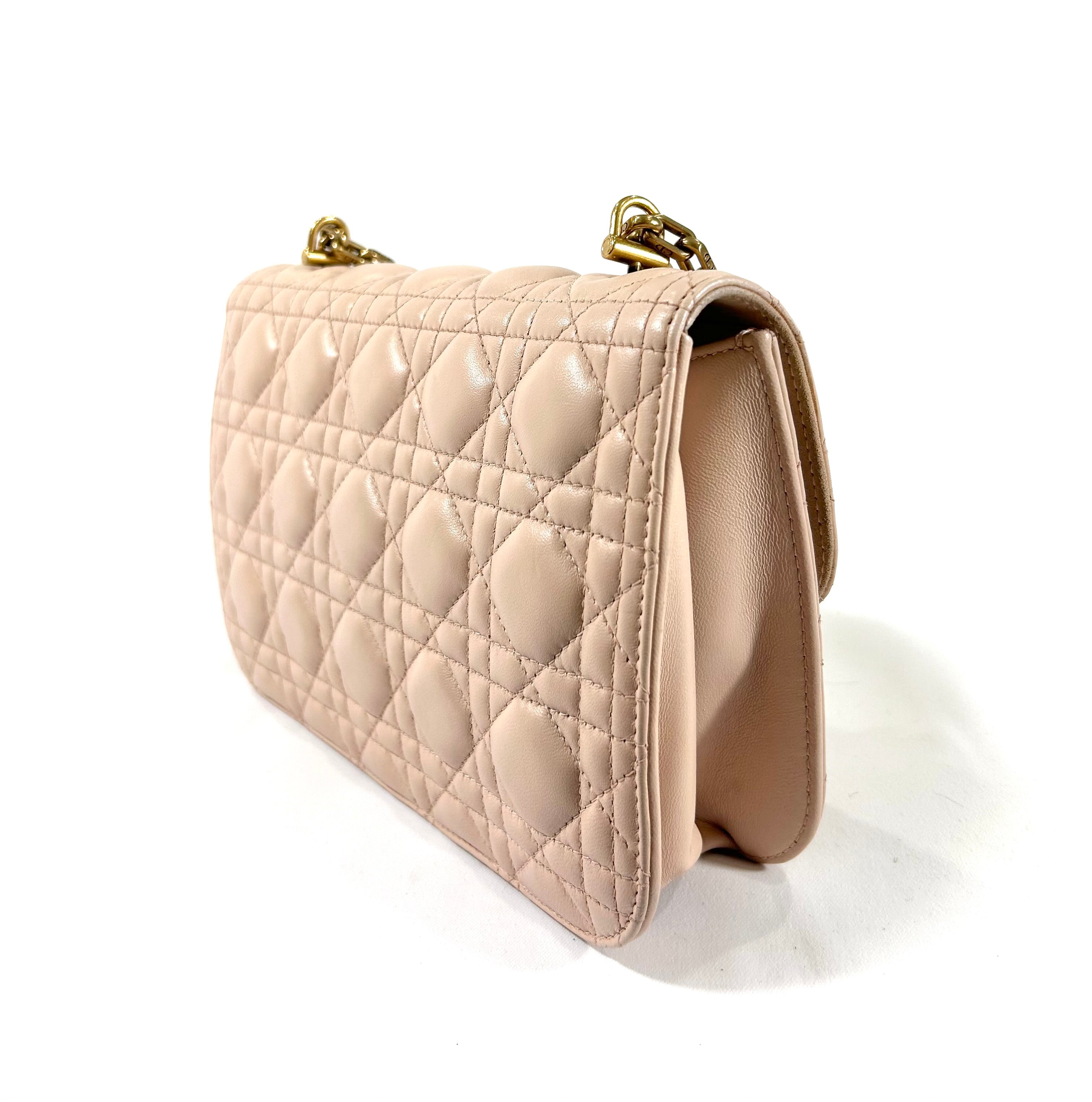 Cannage quilted light pink/beige lamb skin. Great condition. 9Lx6Hx2.5D Brass hardware. Some tarnish to hardware. Chain is removable. Bag can be used as a clutch, shoulder bag or crossbody. No visible scuffs, damage or odor. Clean inside.