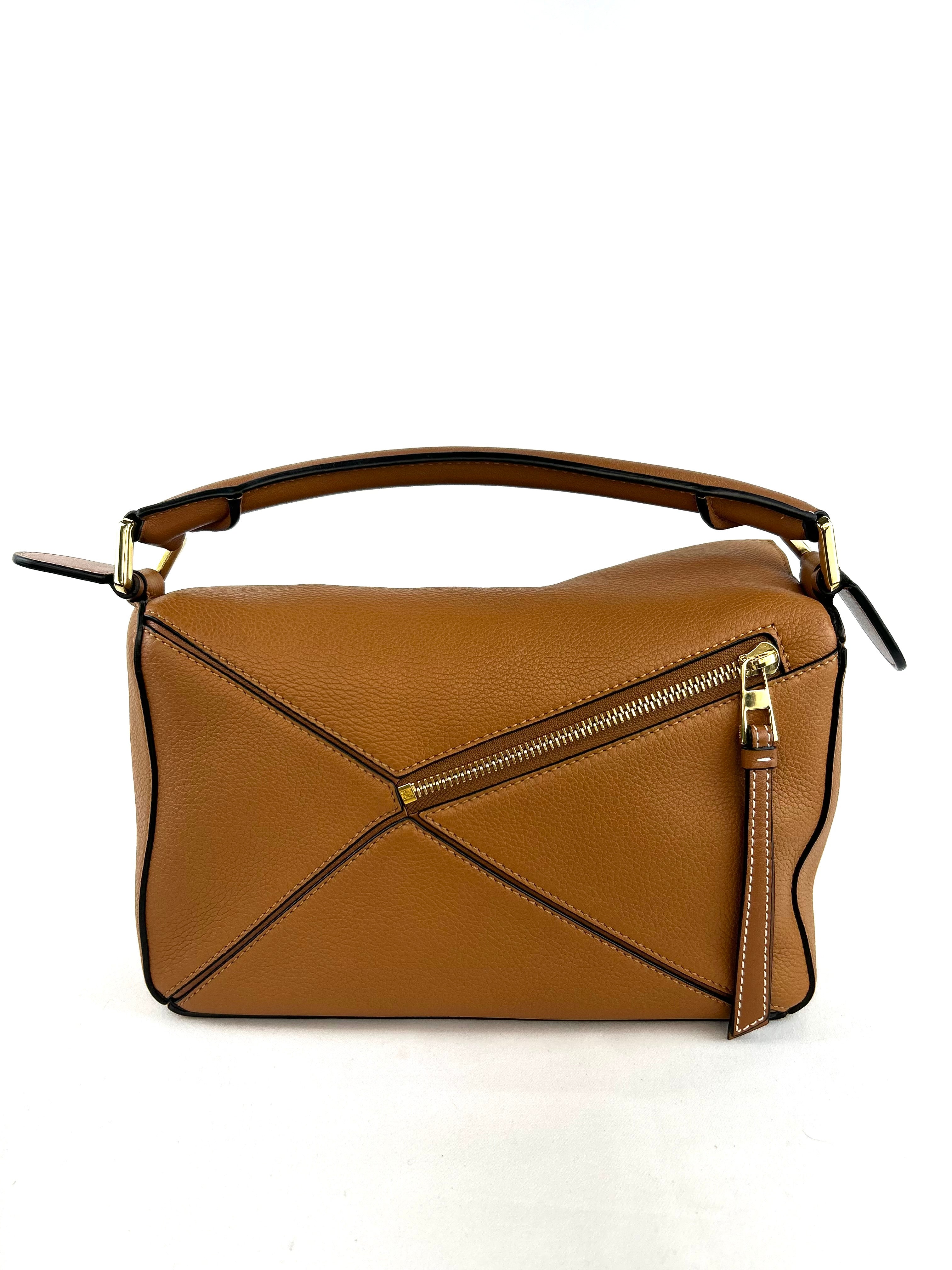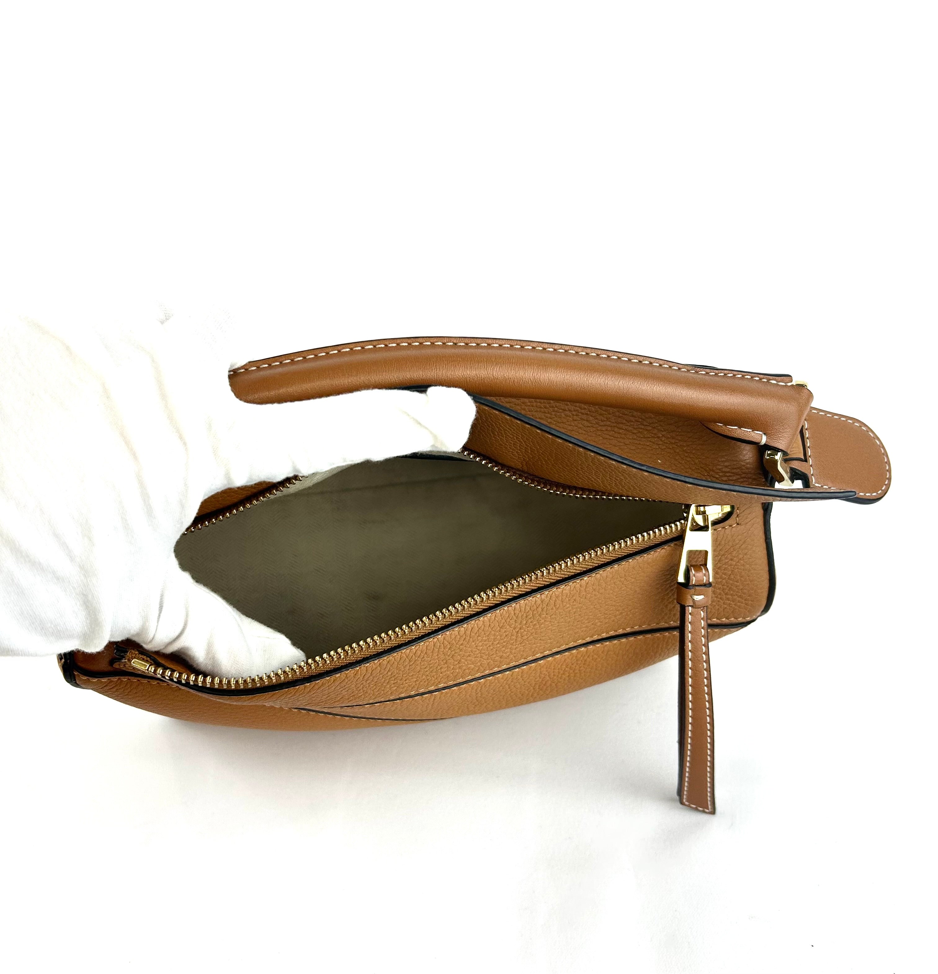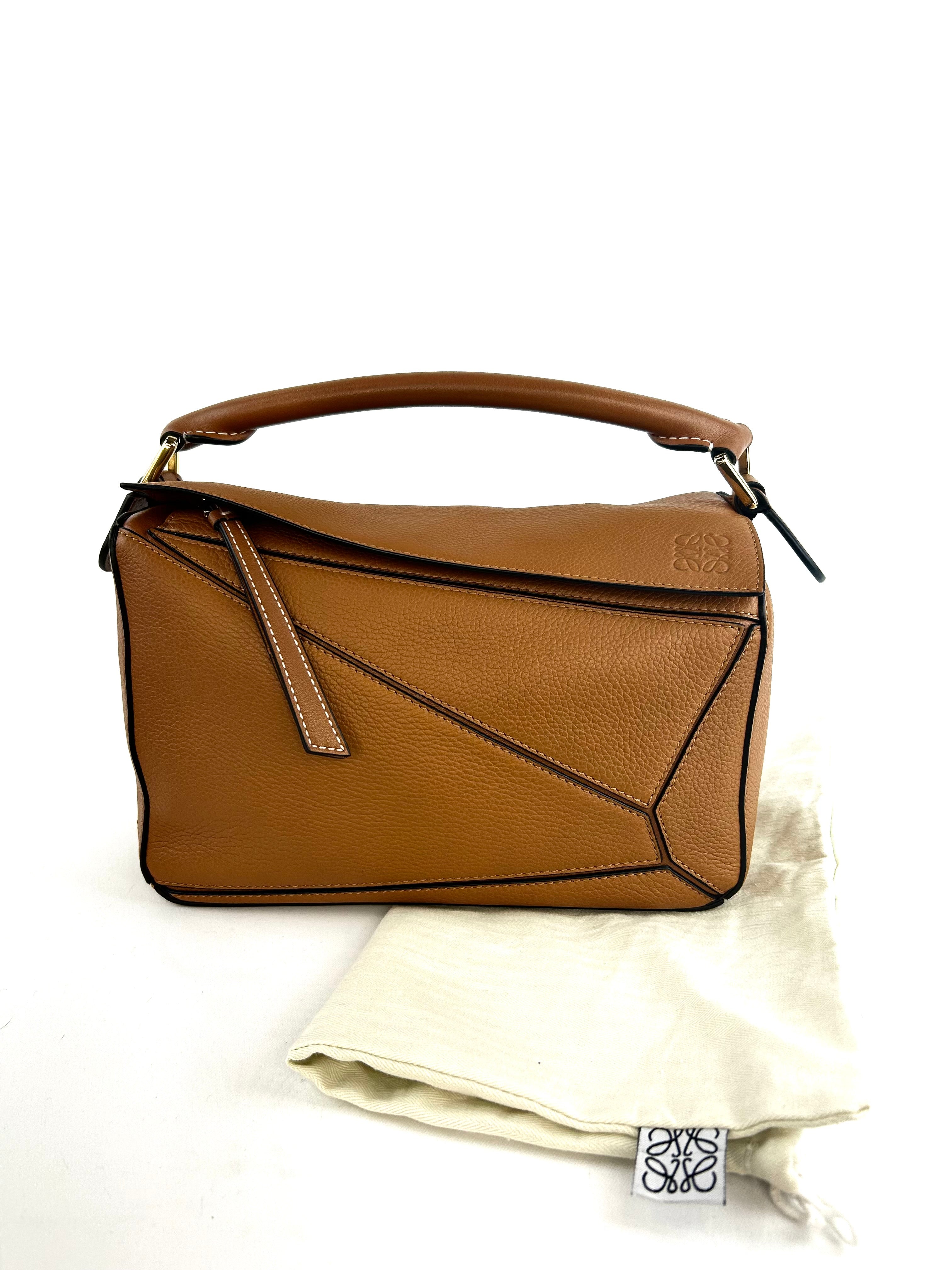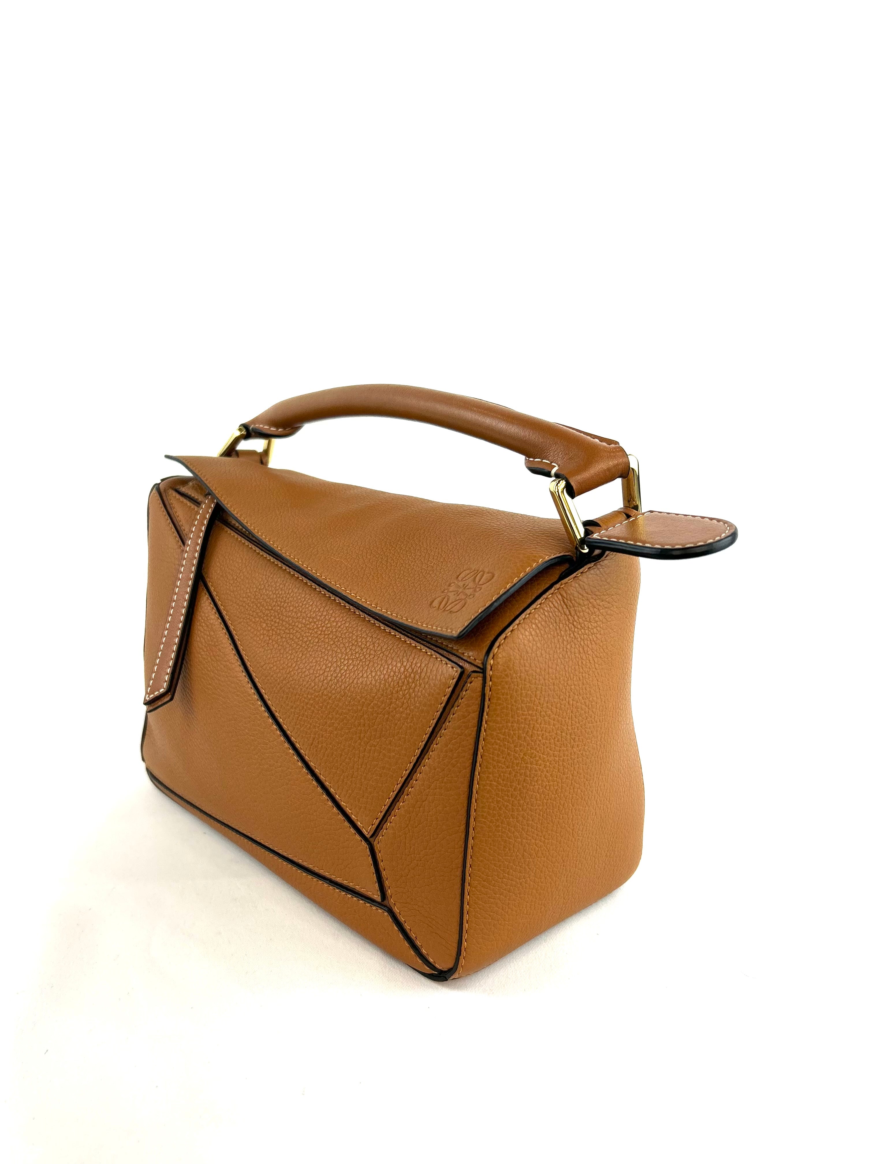 Great unused condition. No flaws. Small Calfskin leather. Soft slouchy Brown/Tan color. This gorgeous handbag is defined by its distinctive geometric lines and cuboid form. Dimensions: 9.5Lx6Hx4D Loewe dust bag included. See pictures for additional details.