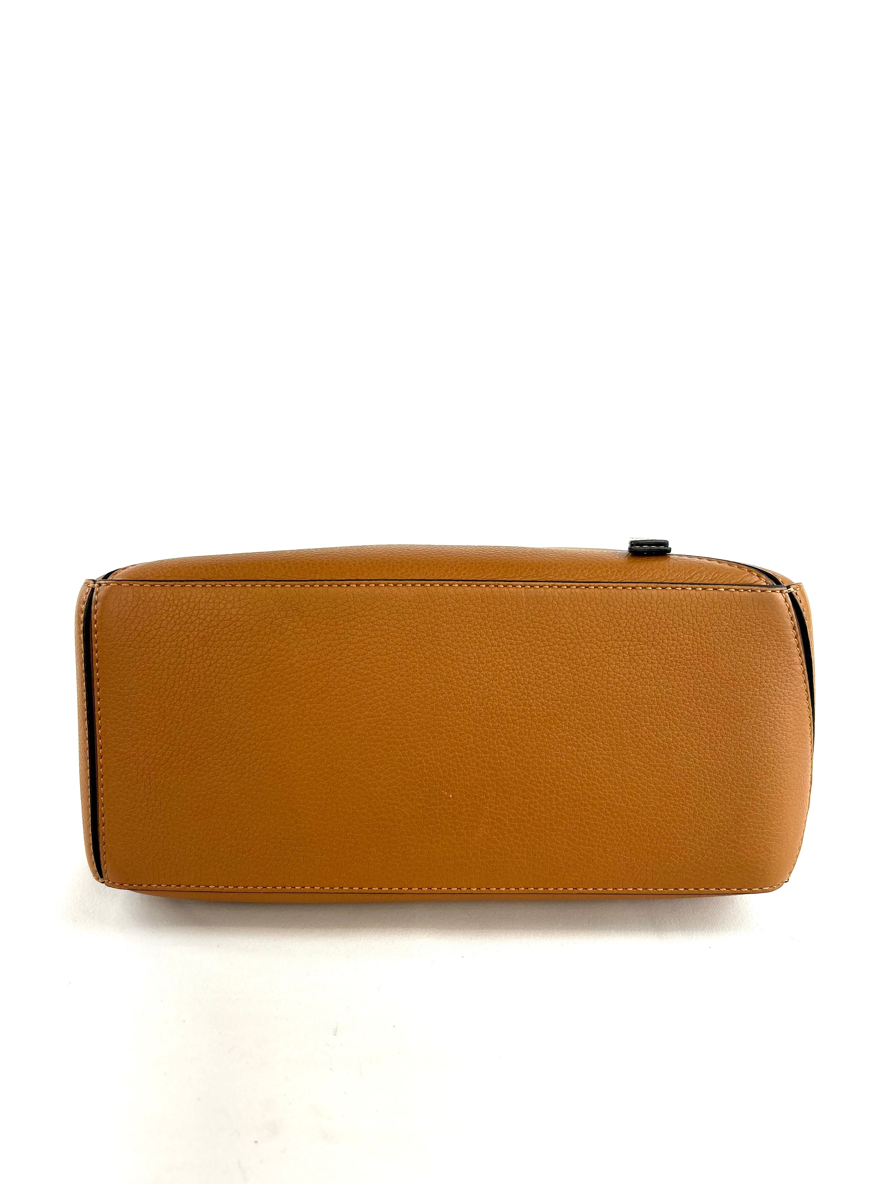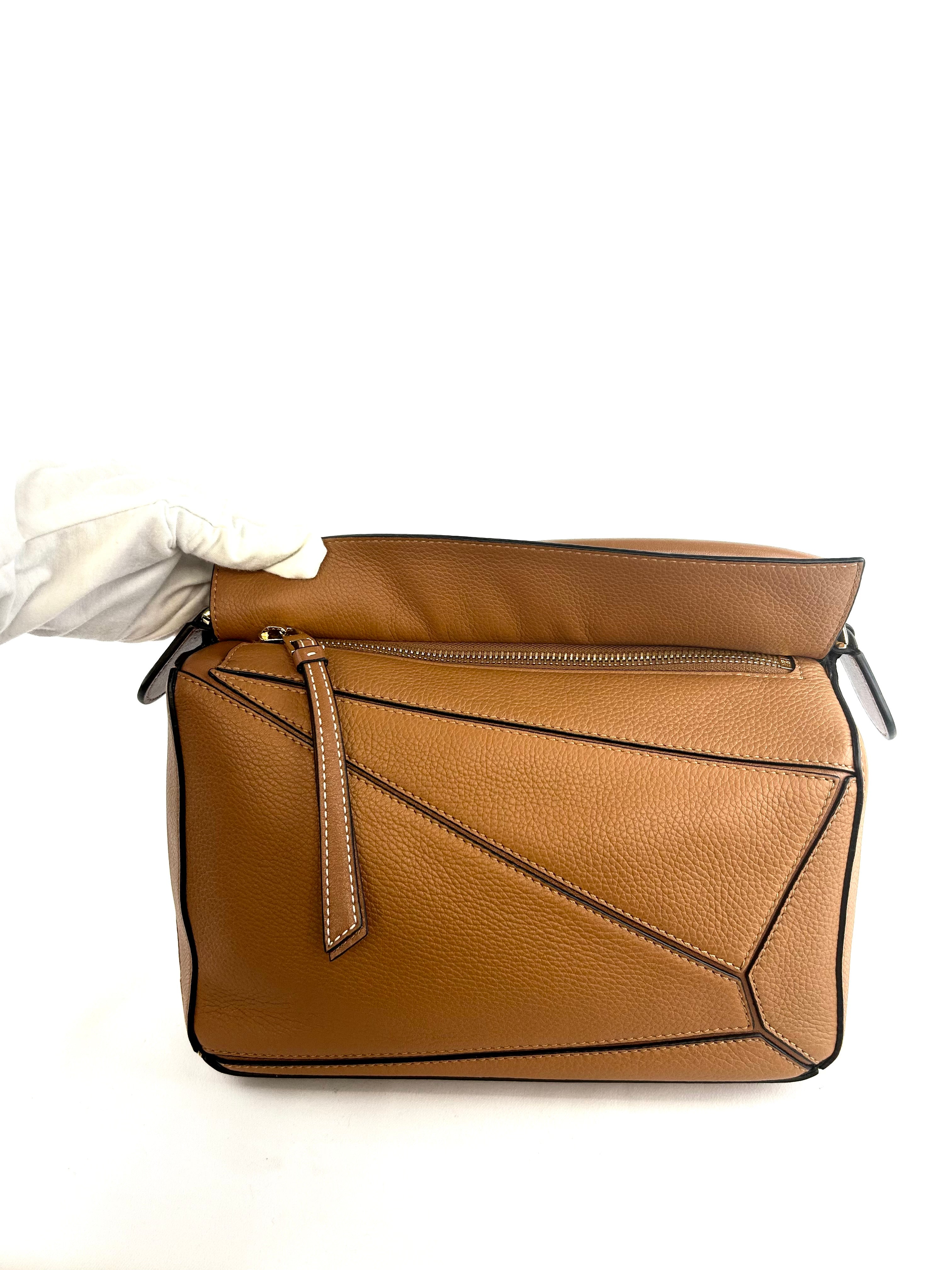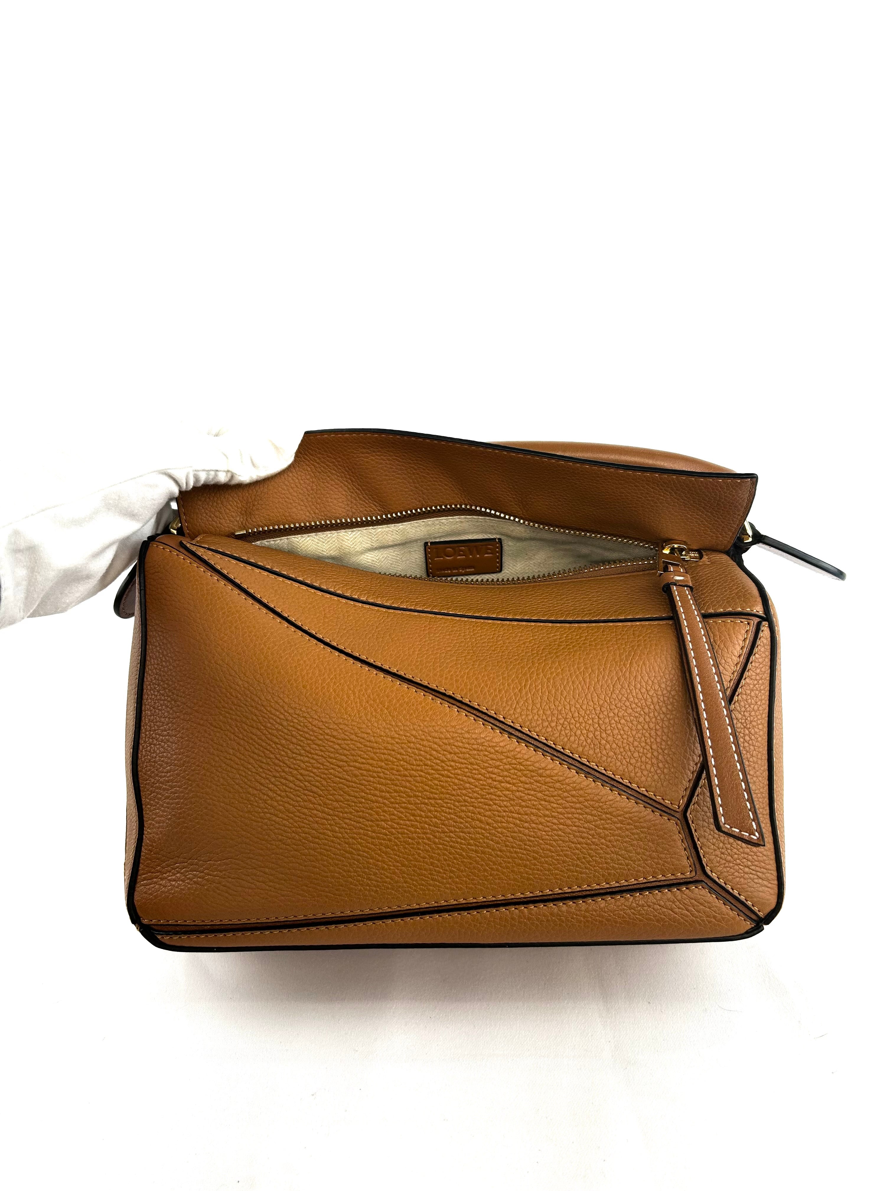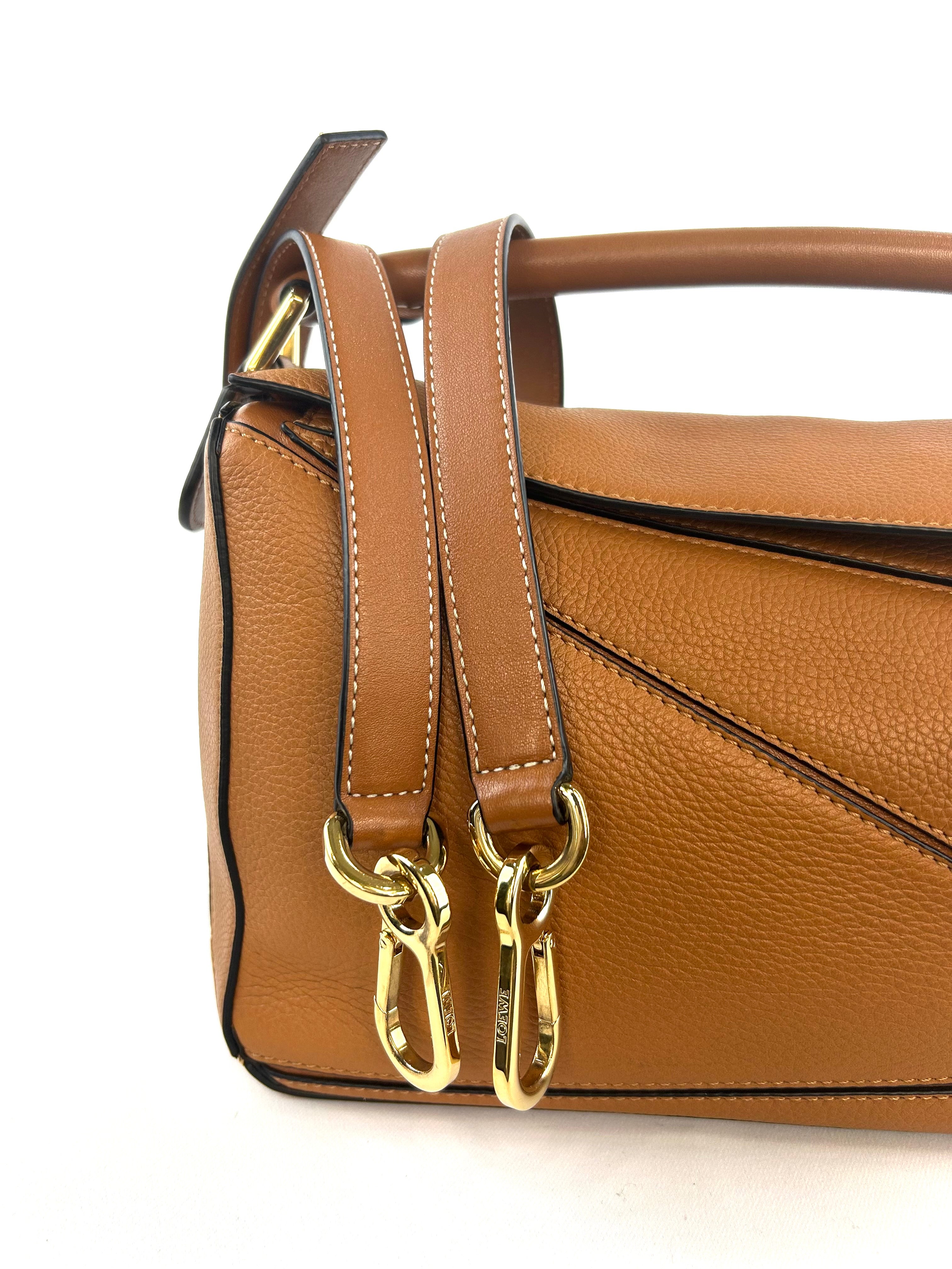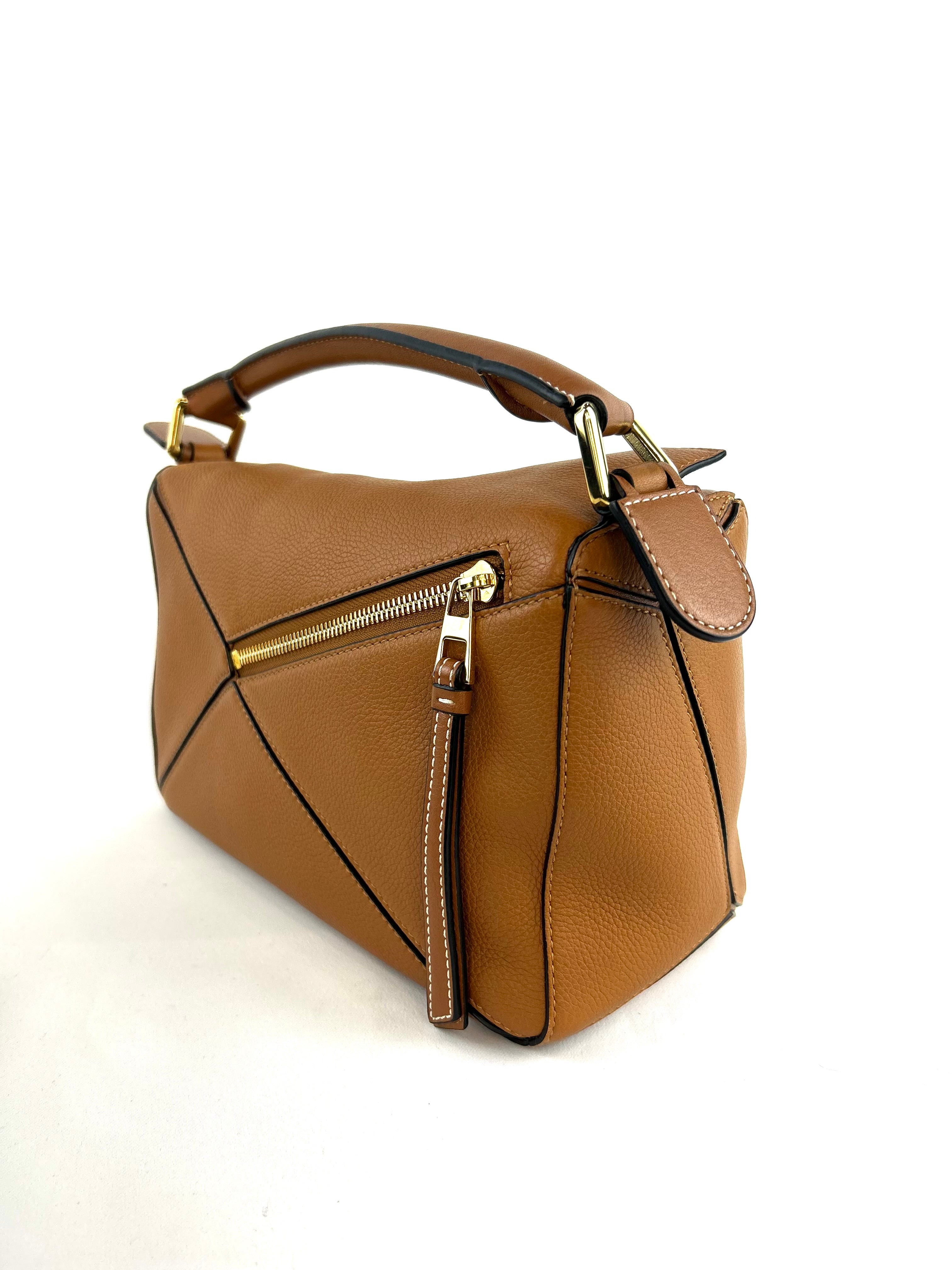 Great unused condition. No flaws. Small Calfskin leather. Soft slouchy Brown/Tan color. This gorgeous handbag is defined by its distinctive geometric lines and cuboid form. Dimensions: 9.5Lx6Hx4D Loewe dust bag included. See pictures for additional details.