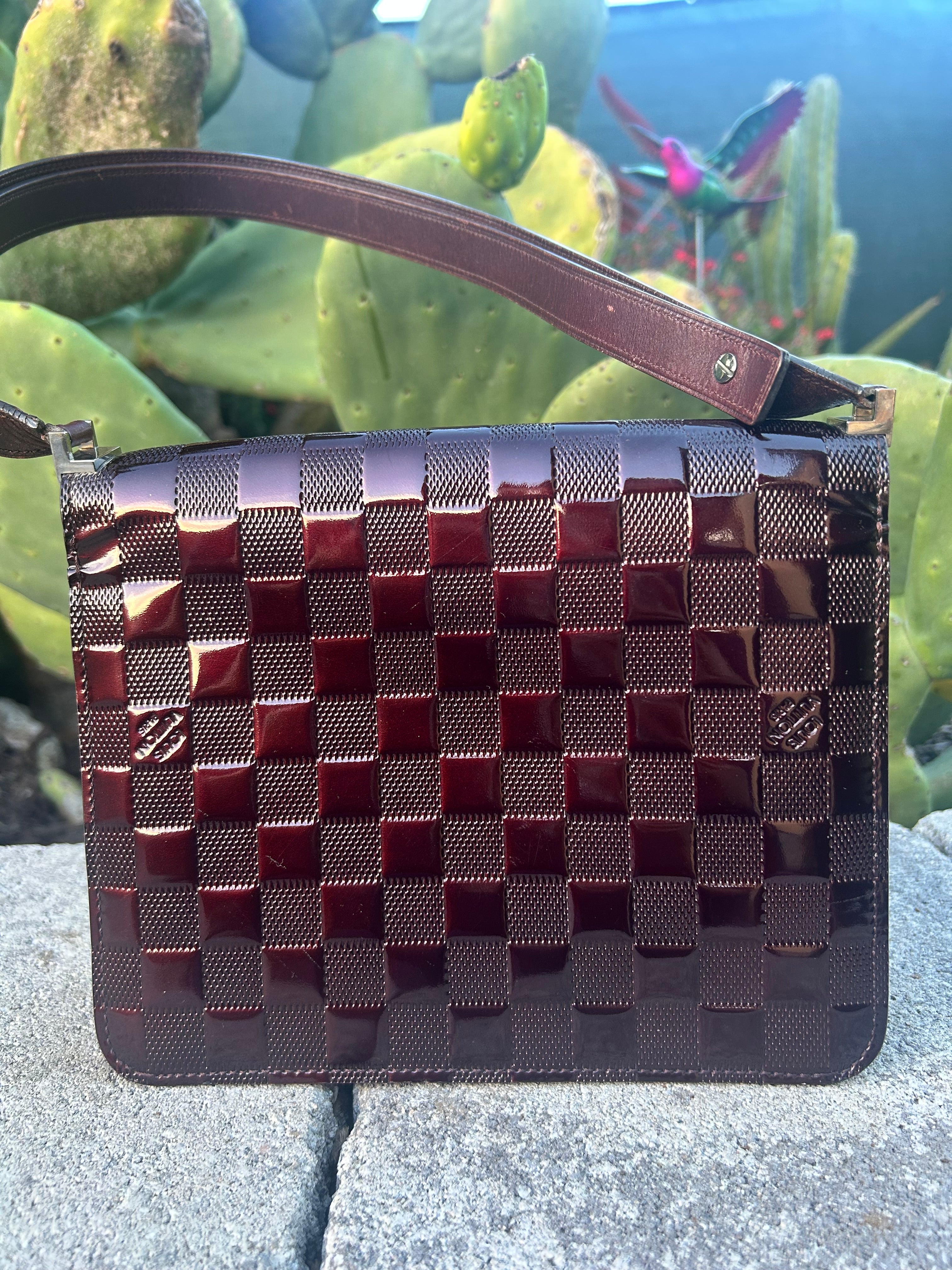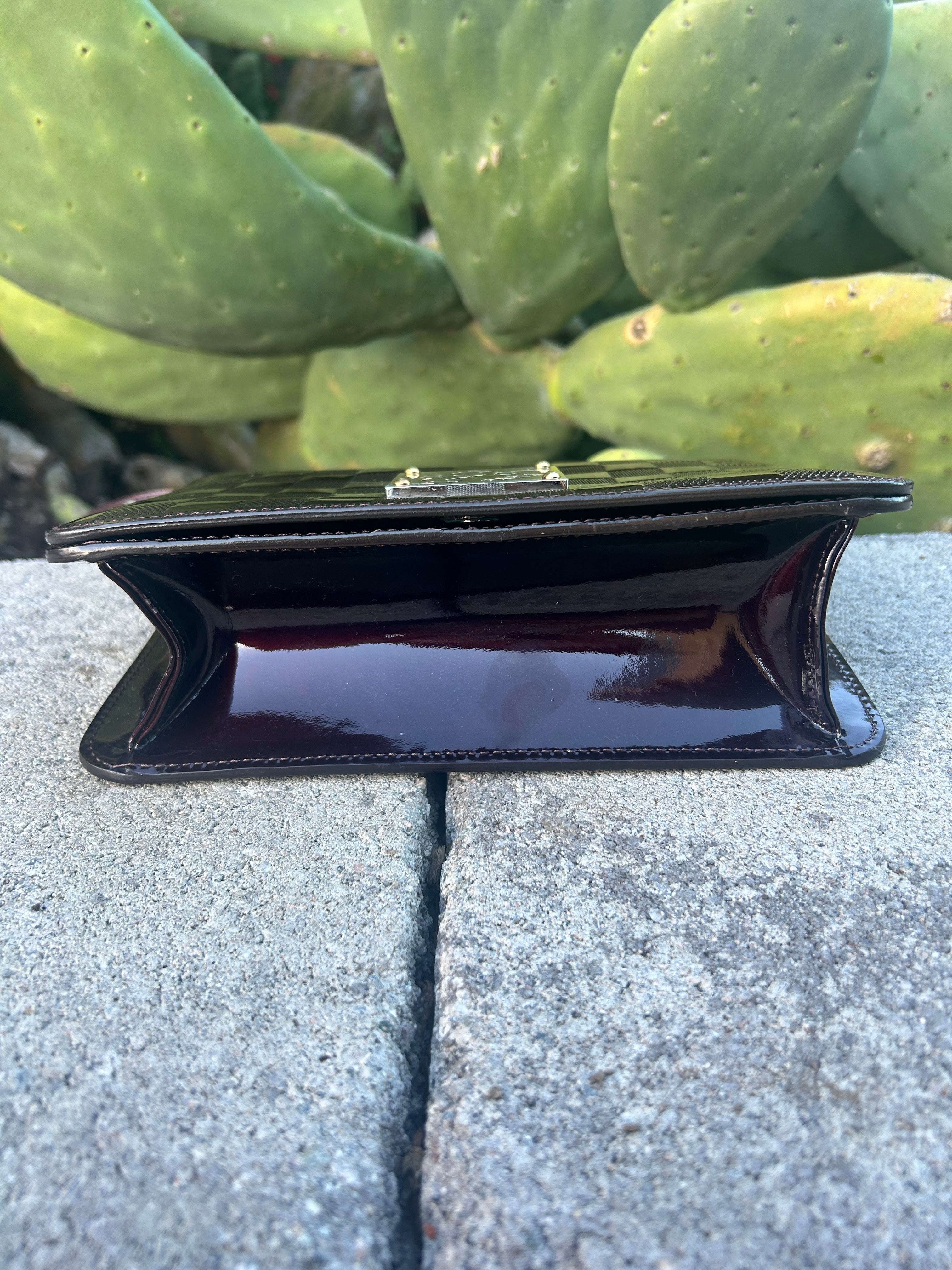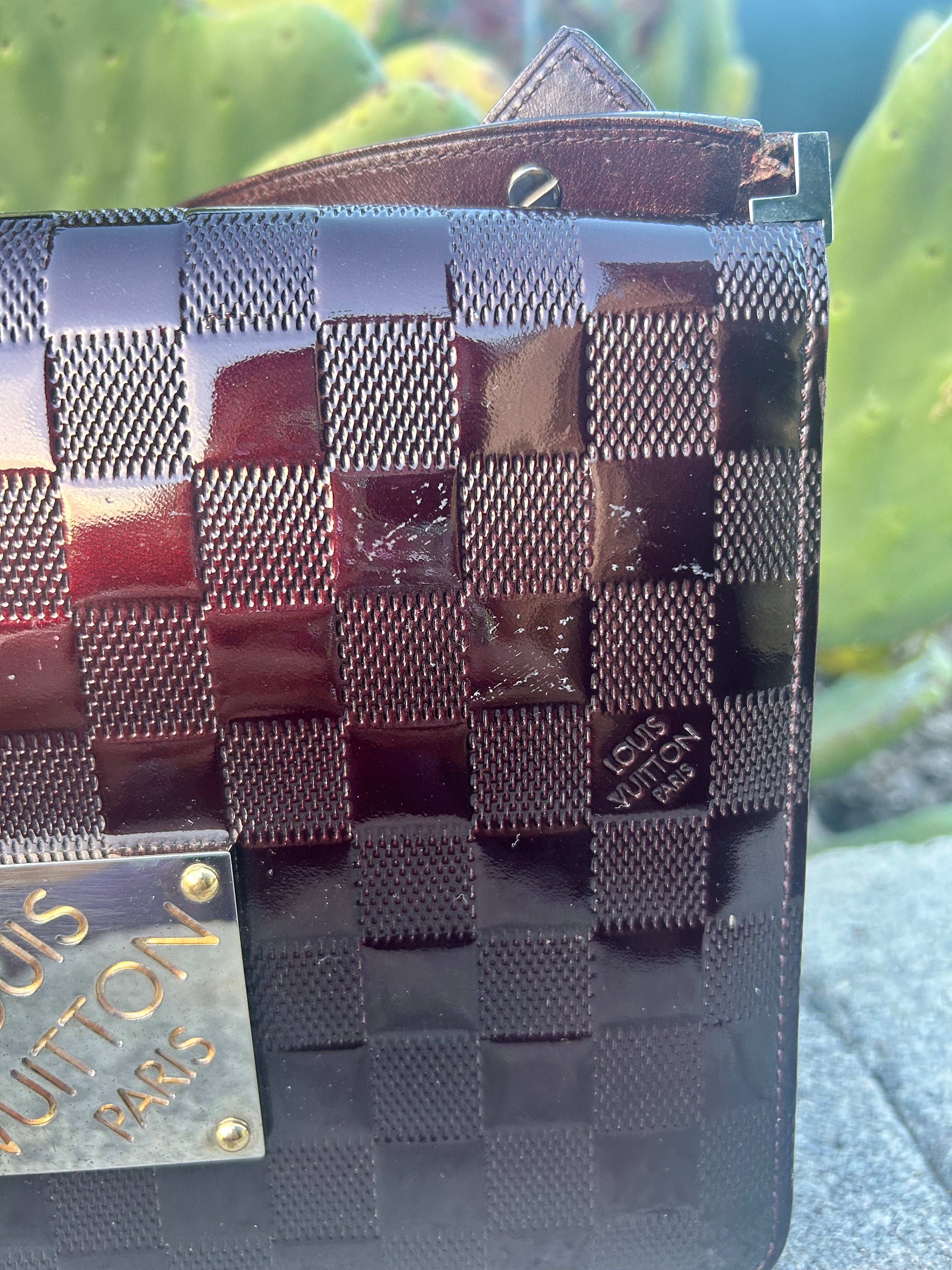 Good condition. Minor marks on patent leather and inside flap. Minor patina and scratches to nameplate. Minor wear to leather straps. Can adjust to two different lengths.