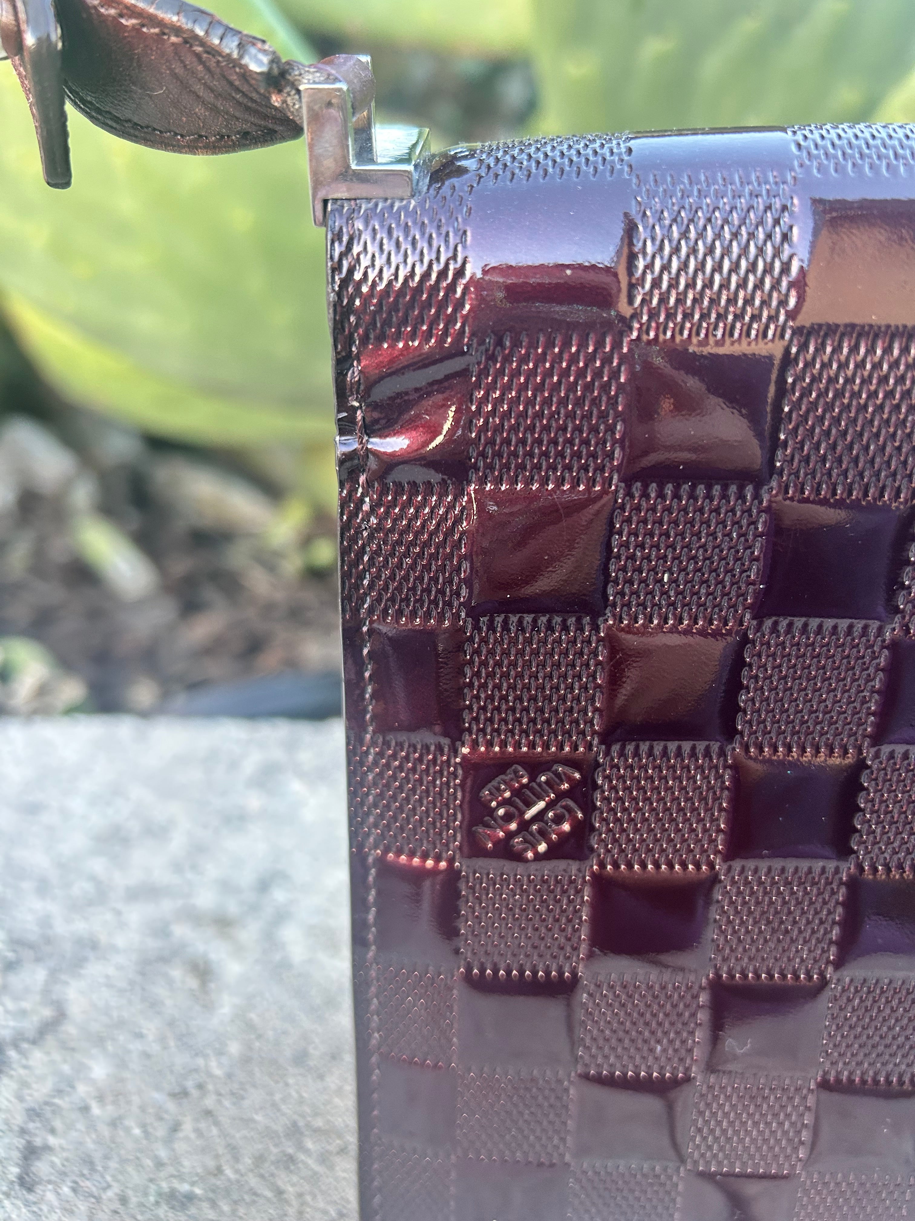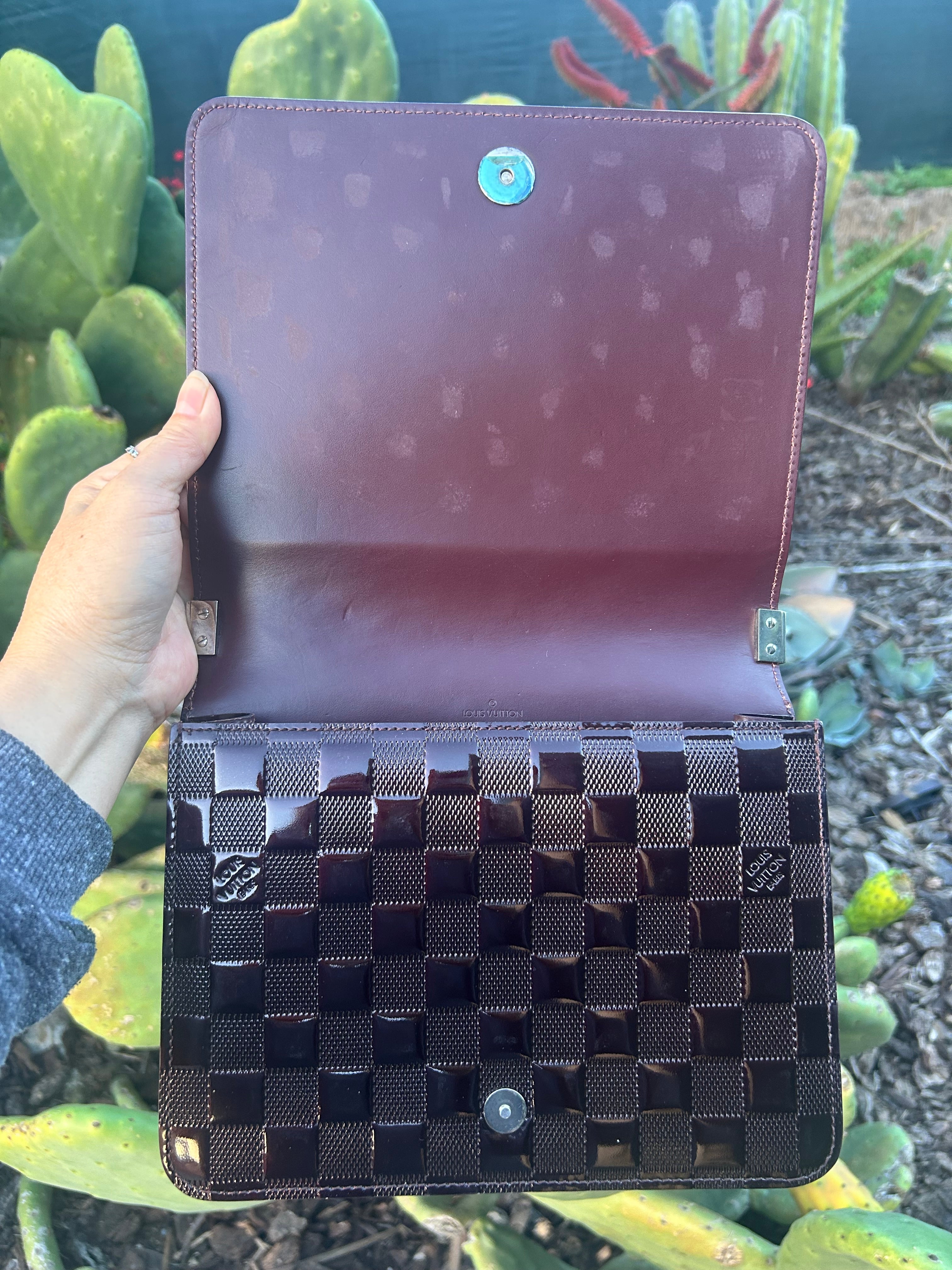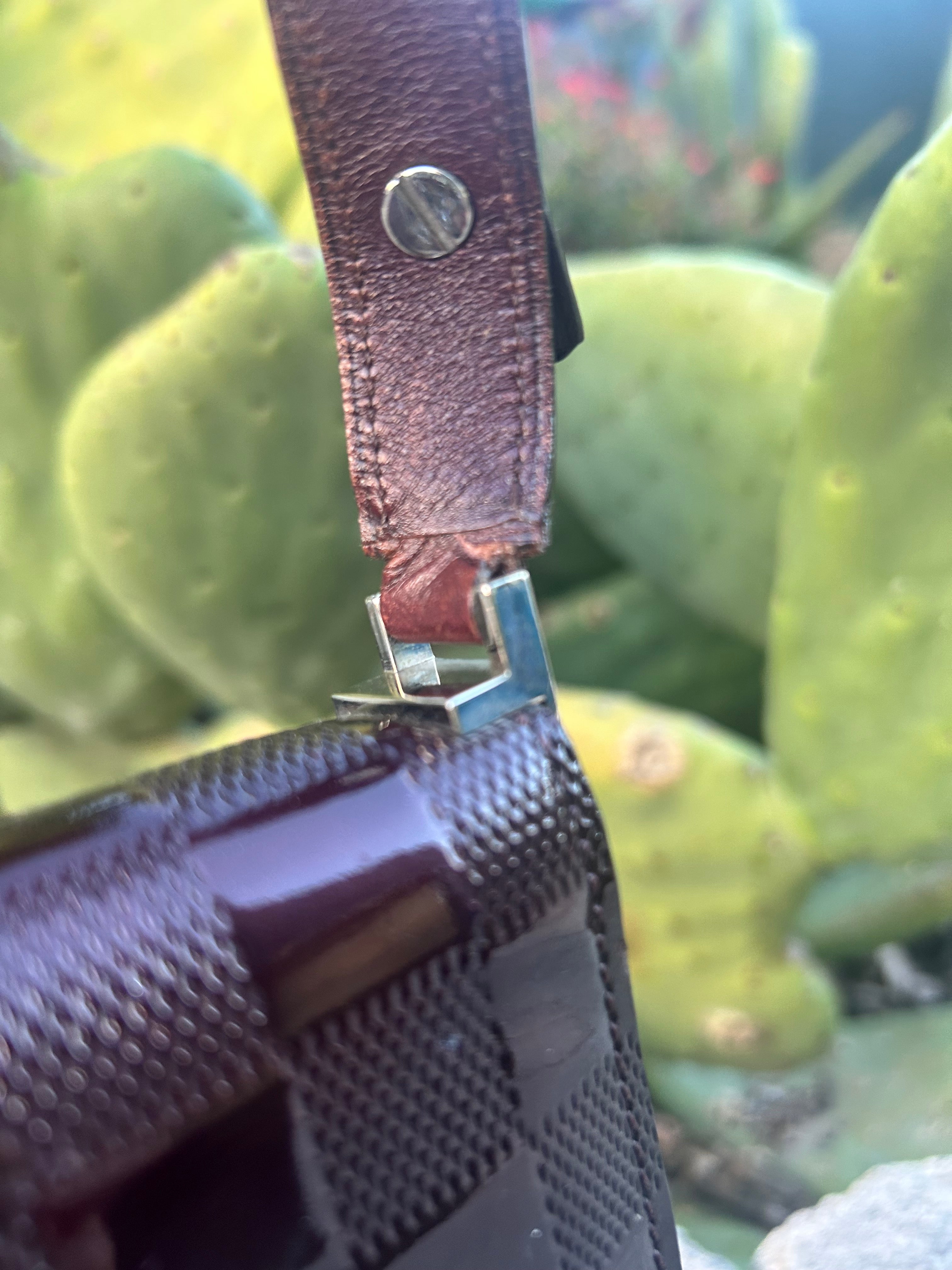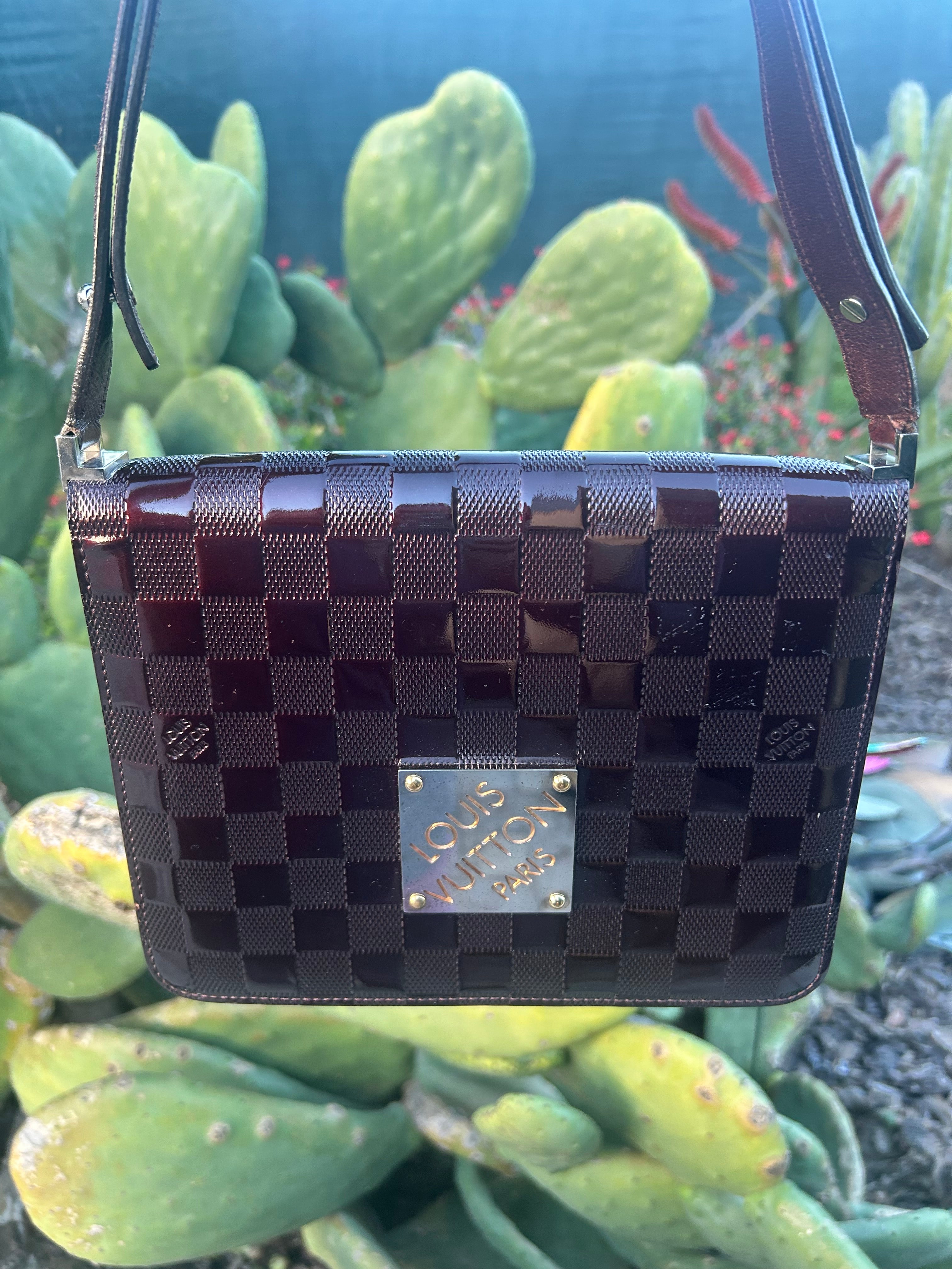 Good condition. Minor marks on patent leather and inside flap. Minor patina and scratches to nameplate. Minor wear to leather straps. Can adjust to two different lengths.