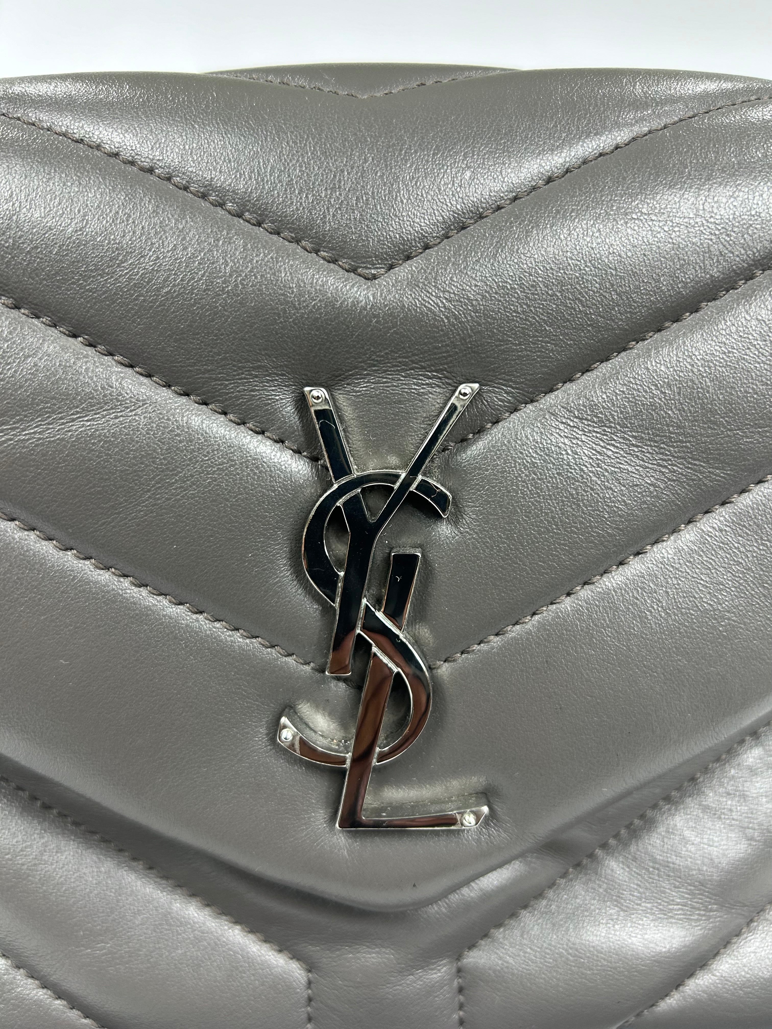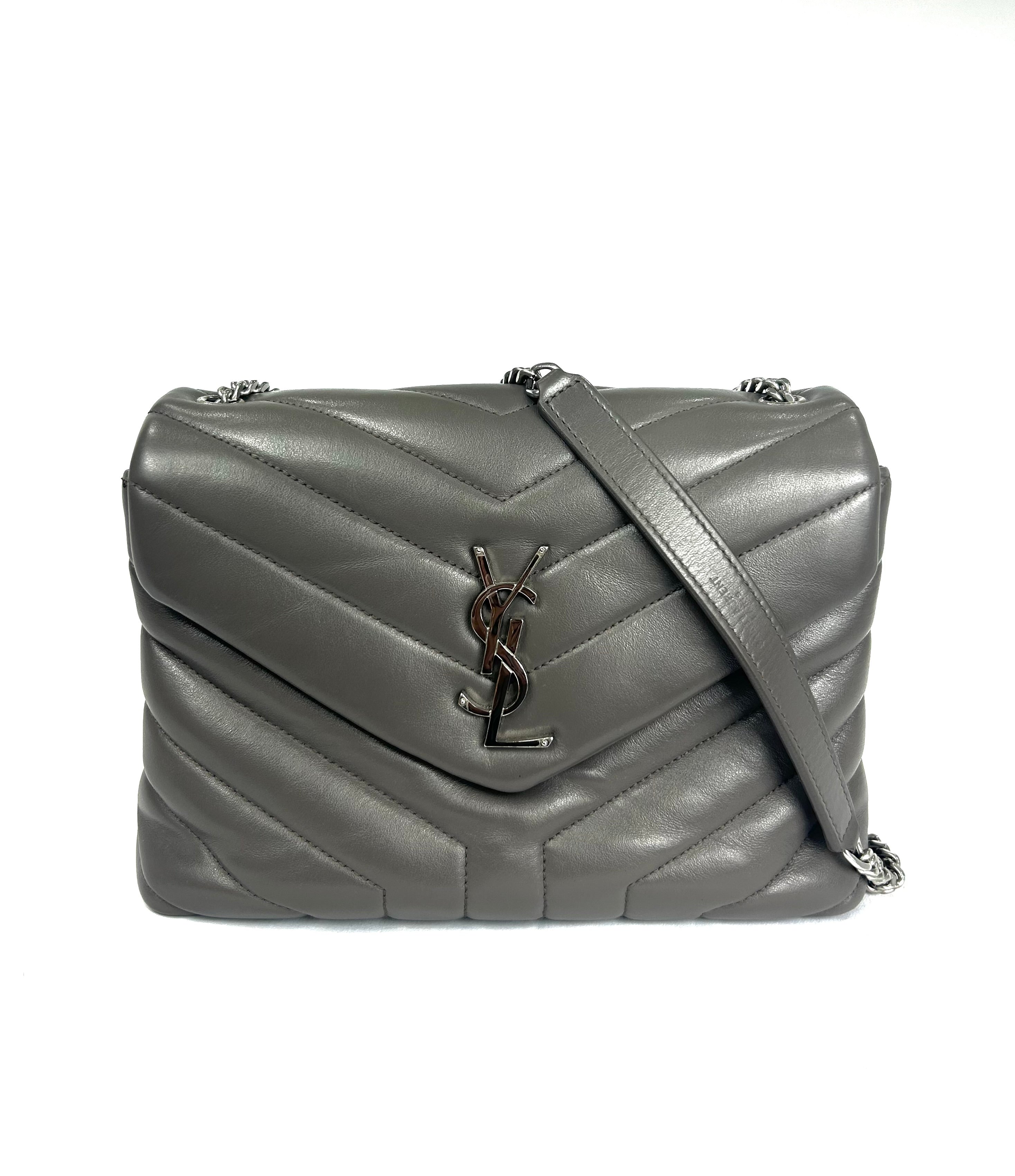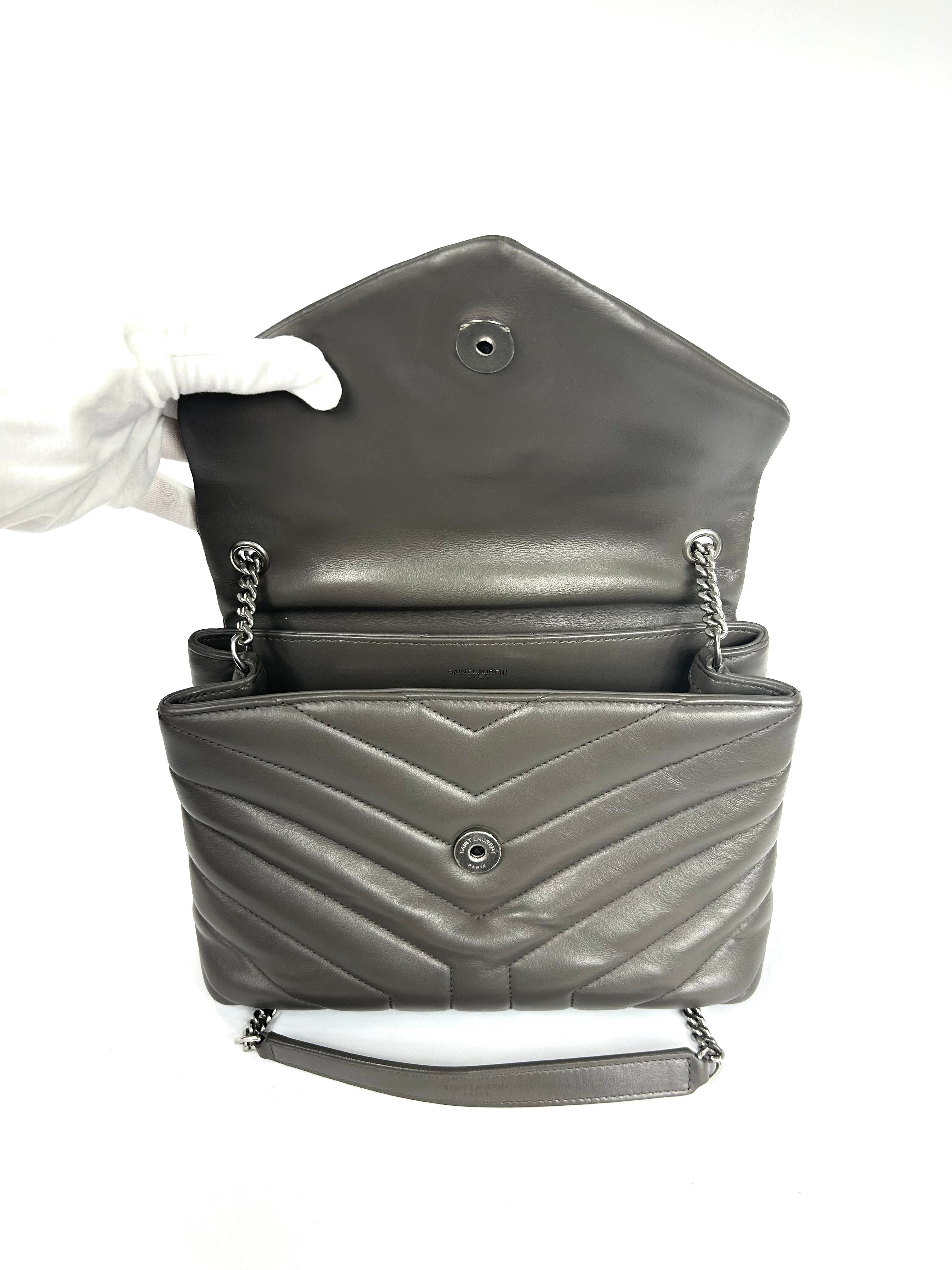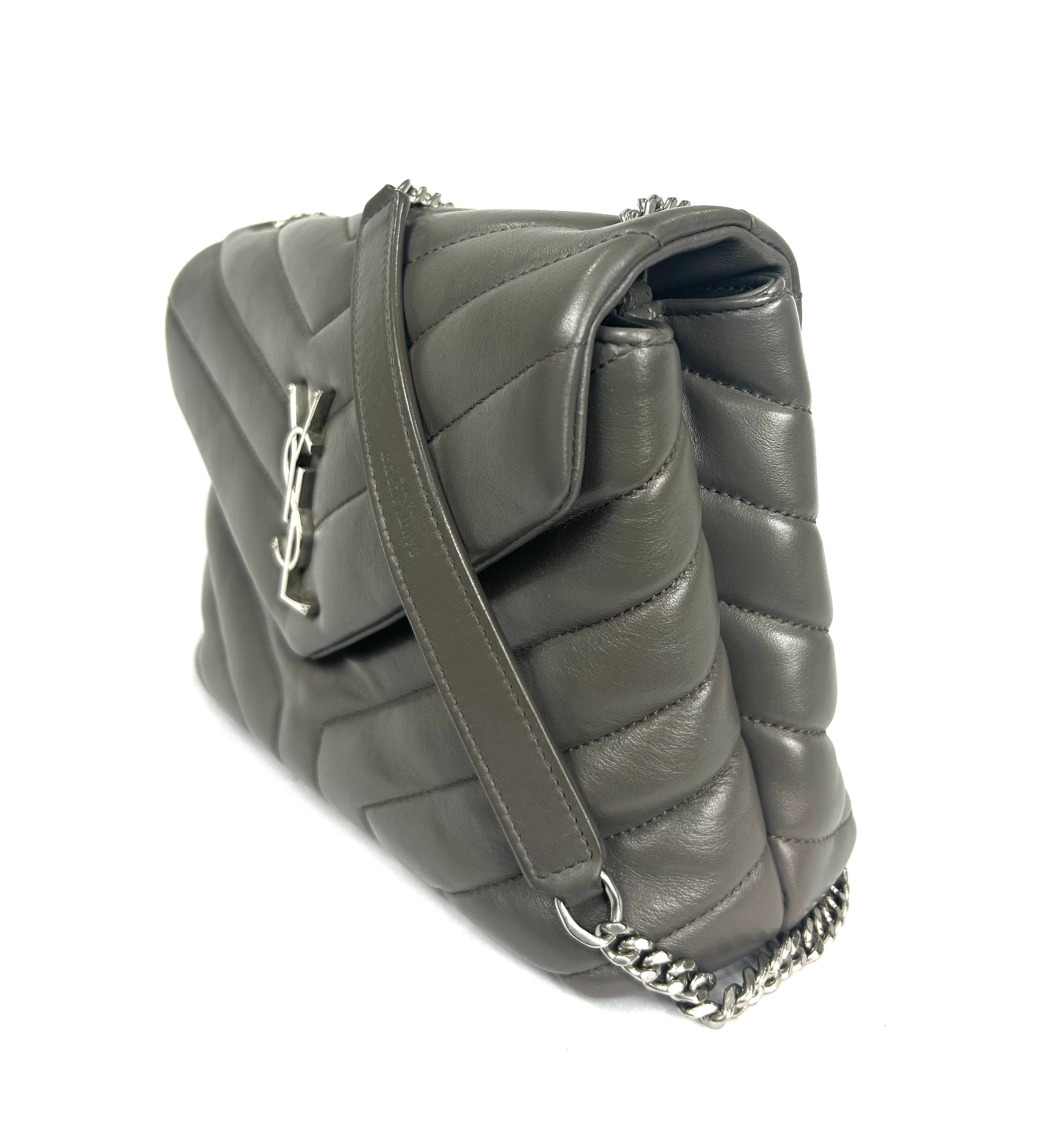 YSL Lou Lou. Like new condition! Calkskin leather. Khaki gray. Y quilted stitching. Silver hardware. Chain strap. Magnetic snap closure. 10Wx7Hx3D 19.5 in. Strap drop. No wears, damage, odor. Does not come with YSL dust bag.