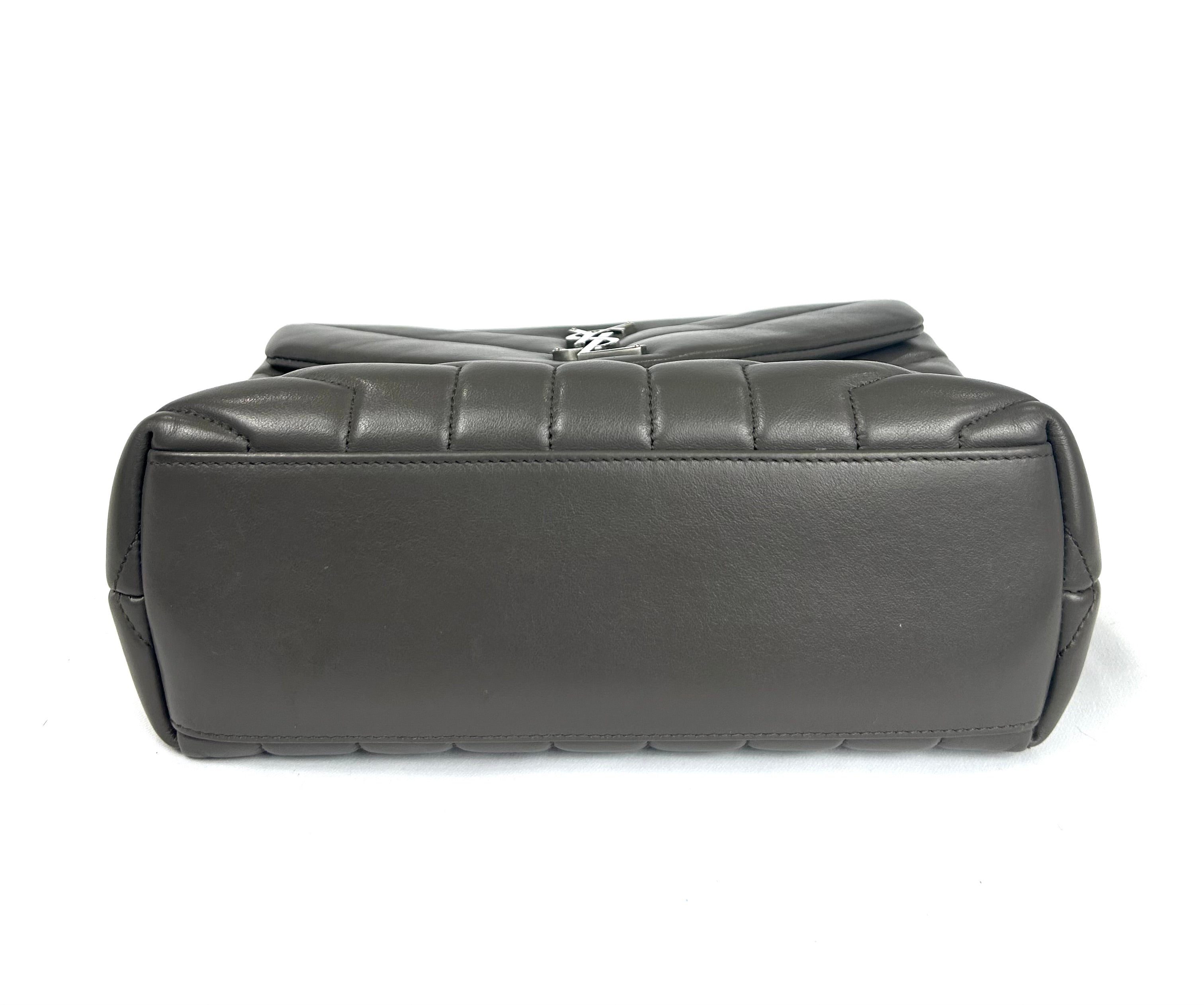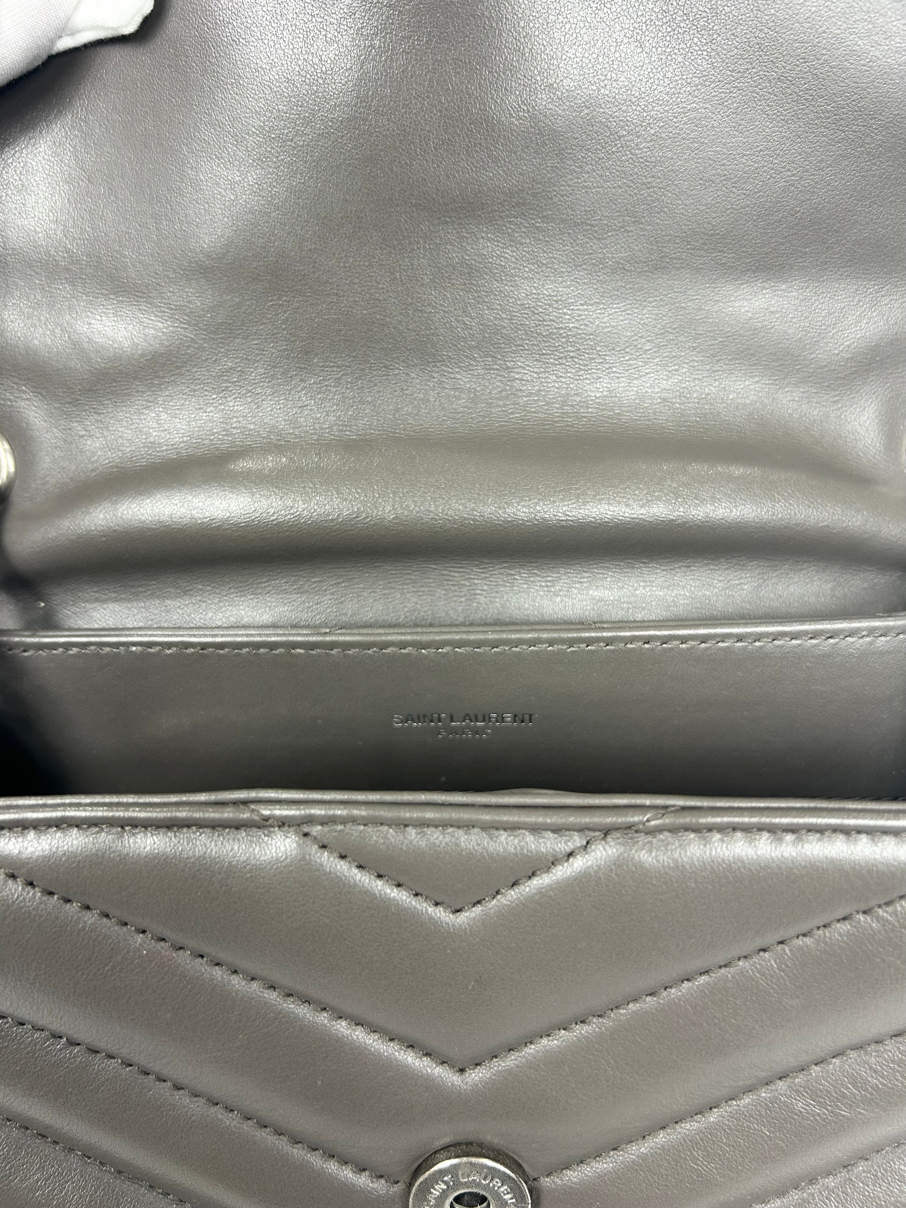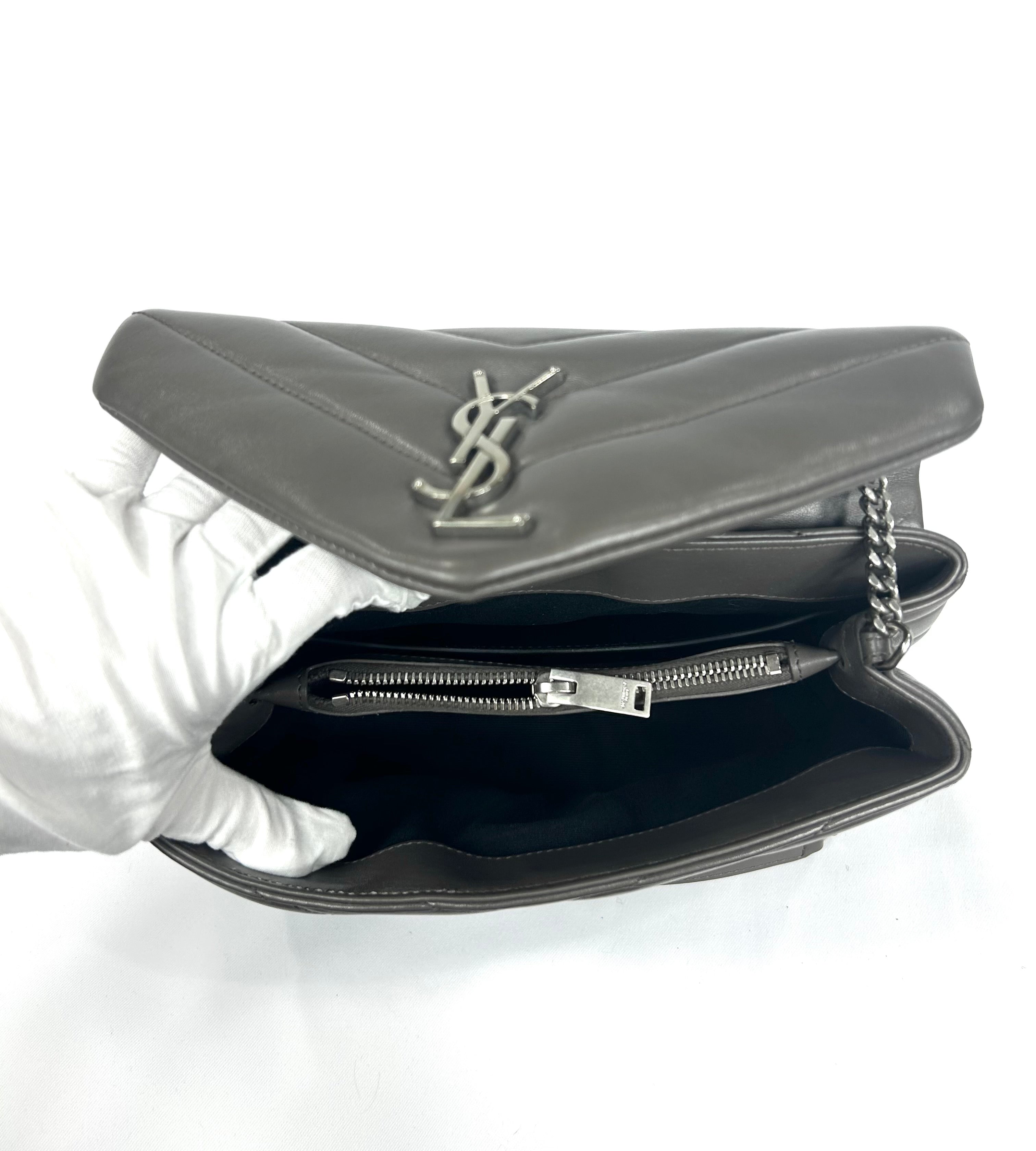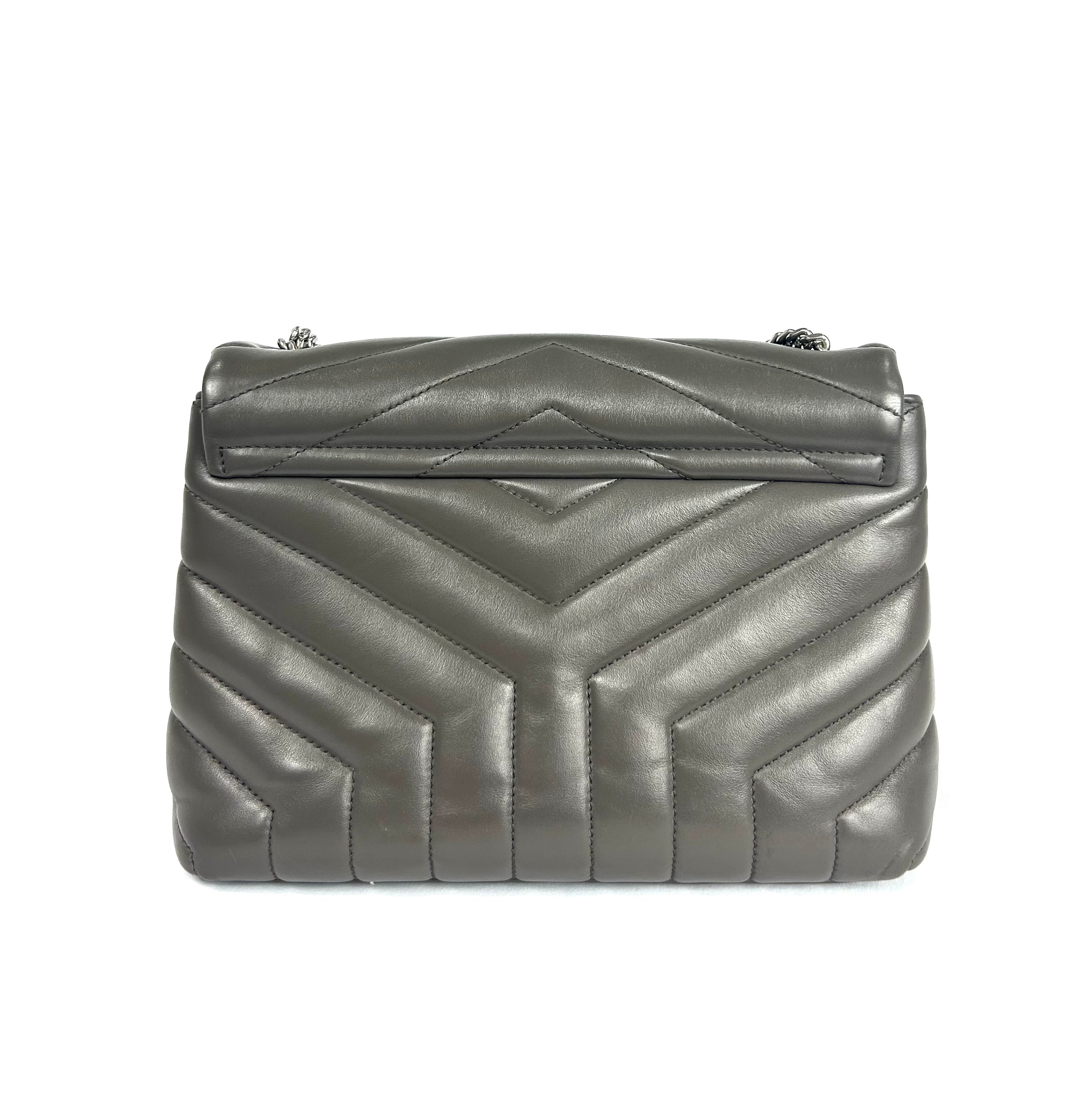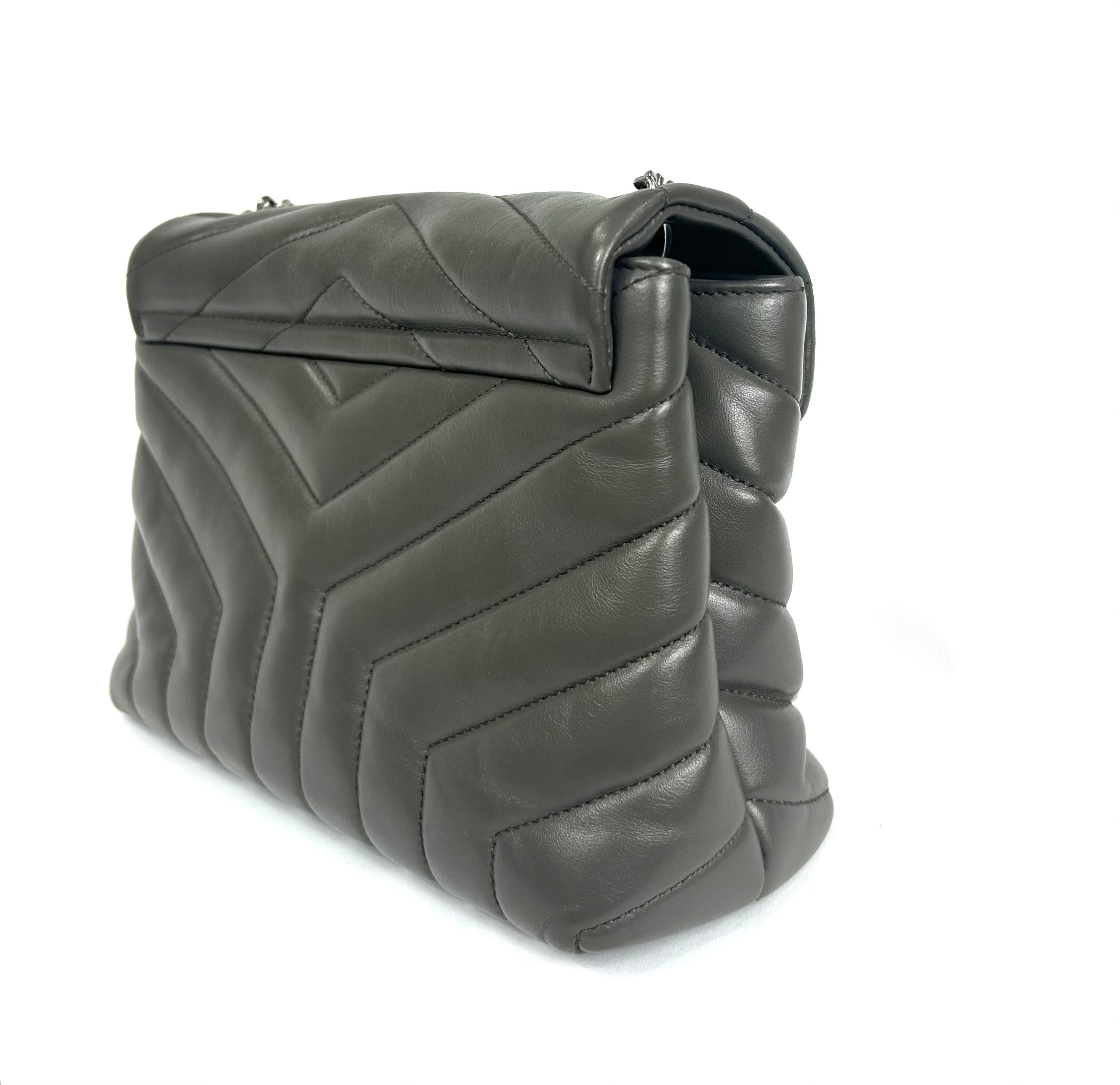 YSL Lou Lou. Like new condition! Calkskin leather. Khaki gray. Y quilted stitching. Silver hardware. Chain strap. Magnetic snap closure. 10Wx7Hx3D 19.5 in. Strap drop. No wears, damage, odor. Does not come with YSL dust bag.